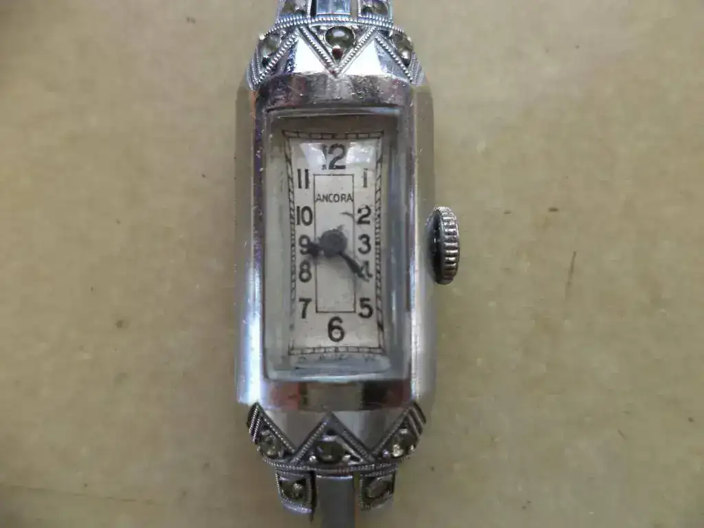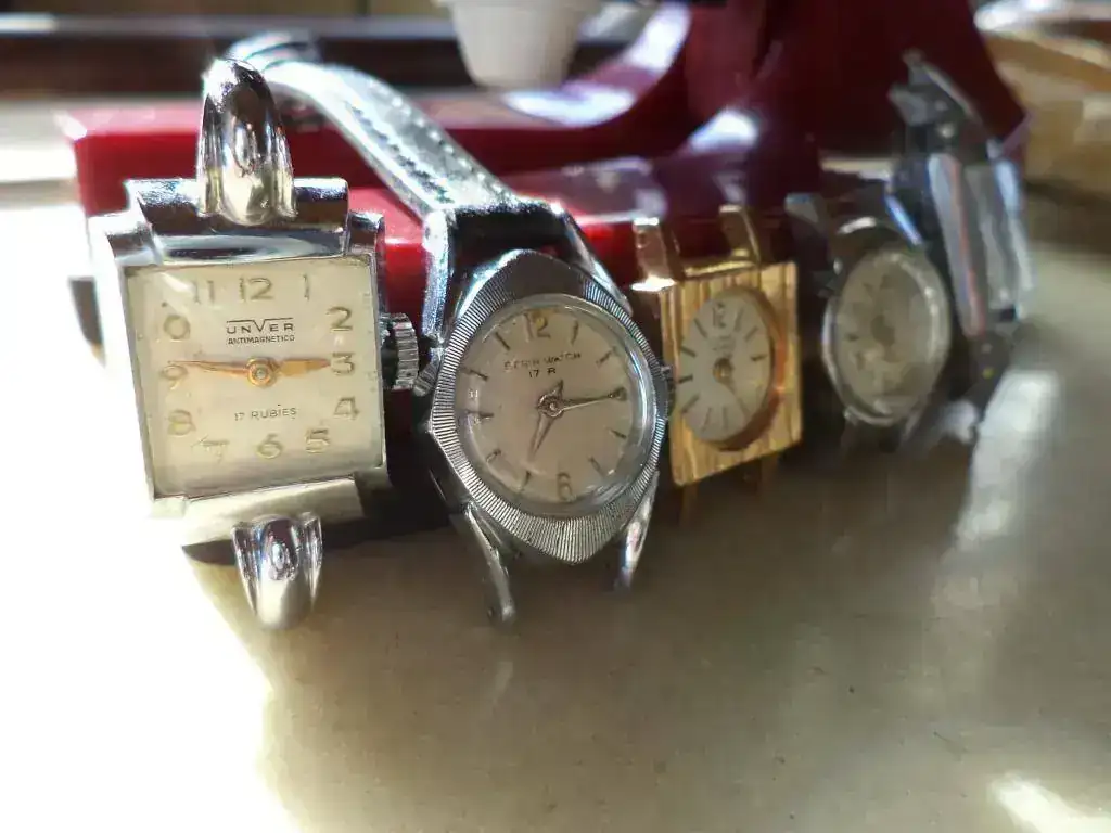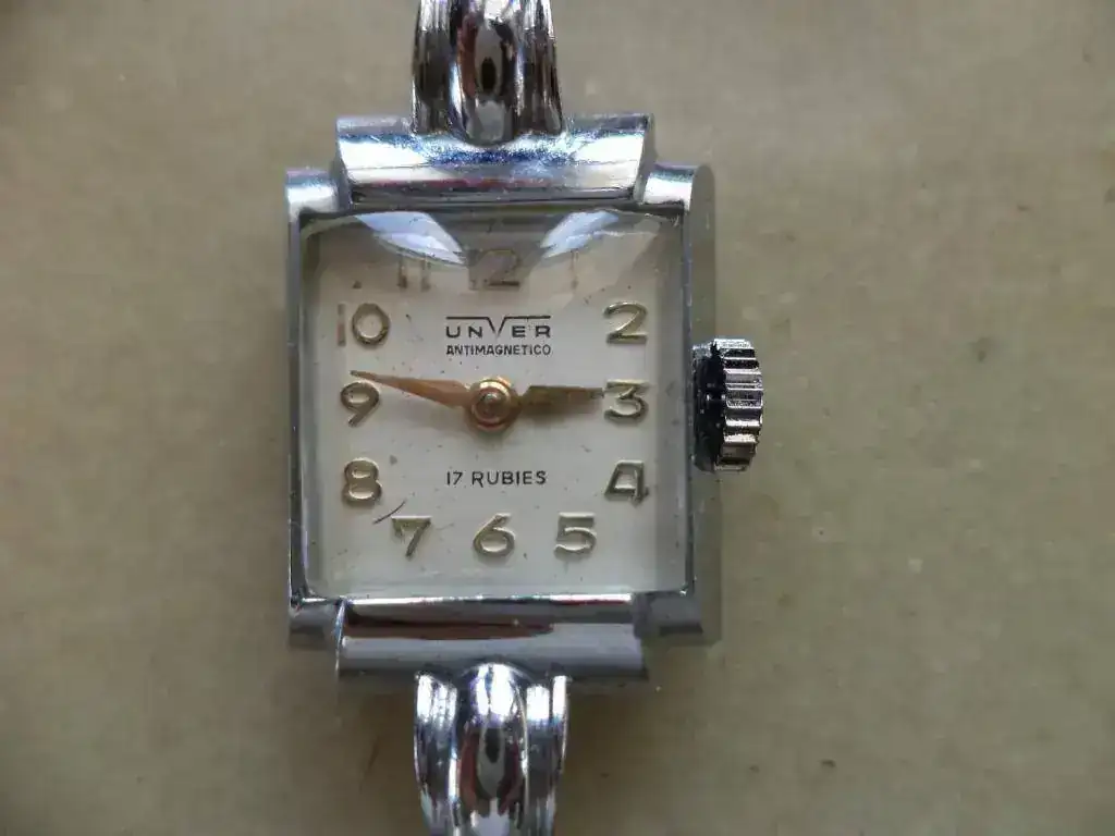 De izquierda a derecha: Diwen (marca de fantasía de origen argentino que el maestro Luis conoce muy bien ); Ancora; Unver, Fero feldmann con un cristal facetado precioso y un Berus watch... del que no tengo rastros.