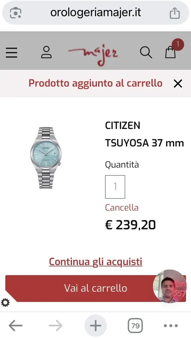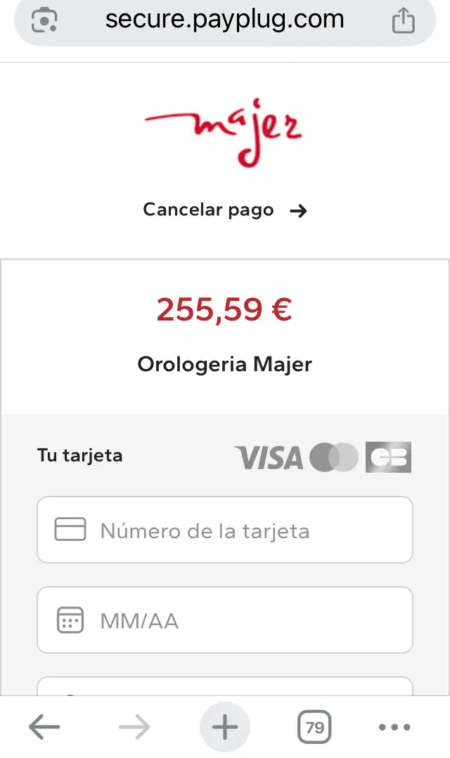 Tienes que inscribirte en la web de la Relojería Majer (orologeriamajer.it), y te aplican automáticamente un 20% de descuento. Pero a la hora de pagar con tarjeta, el precio se queda en 255€…
