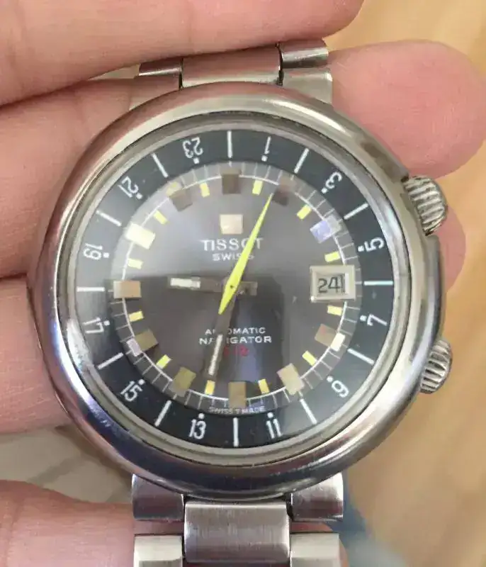 Ese mismo año de 1953, Tissot conmemoraba su centenario presentando el modelo Navigator que permite conocer la hora en 24 husos horarios; un reloj pensado para altos ejecutivos que comenzaban a pasar mucho tiempo volando entre diferentes países. No poseo esa unidad, pero a cambio tengo un Tissot Navigator T12 de 1972, con su estética diver compressor y bisel interno 24H giratorio mediante la segunda corona :