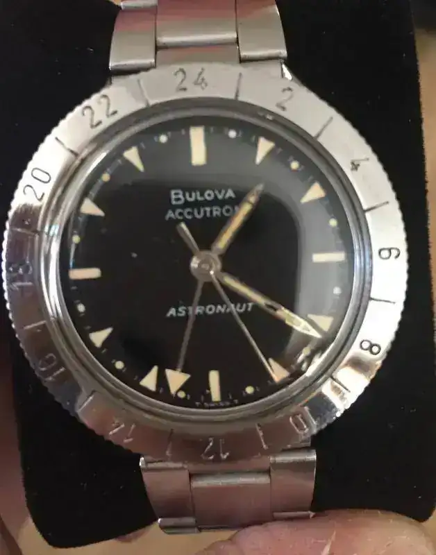 En 1960, tras el éxito del calibre 214 Accutron de Bulova, y en plena Carrera Espacial y Guerra Fría, el General Omar Bradley, director de la NASA, encarga a Bulova un reloj con calibre Accutron, GMT y bisel 24h, luminiscente y sin corona exterior, nace el Bulova Accutron Astronaut, no sólo un autentico "Moonwatch" sino el reloj usado por los vuelos secretos de los aviones-espía (A-12, SR-71, U-2 y X-15). El modelo presentado en de 1966 :