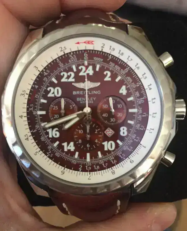 Otra marca que marco el inicio de la carrera espacial con un reloj 24h fue Breitling con su modelos Cosmonaute de 1962. Usado por astronautas como Scott Carpenter, pero que quedo relegado posteriormente al no cumplir las especificaciones técnicas pretendidas para ser el reloj oficial de la NASA por su escasa resistencia al agua, siendo Omega el vencedor. Este modelo era básicamente una versión 24H del Breitling Navitimer que tanto éxito cosecho entre pilotos comerciales por sus reglas de calculo de vuelo. El modelo 24H presentado no es un Cosmonaute, sino un Breitling for Bentley Le Mans de 2003, ref. A22362, que lanzó la marca para celebrar la victoria de este año en la mítica carrera por el equipo Bentley/Breitling. Se mueve con un calibre basado en un ETA 2892-A2 con modulo Flyback Cronómetro Dubois Dupraz y certificación COSC, un autentico placer de máquina :