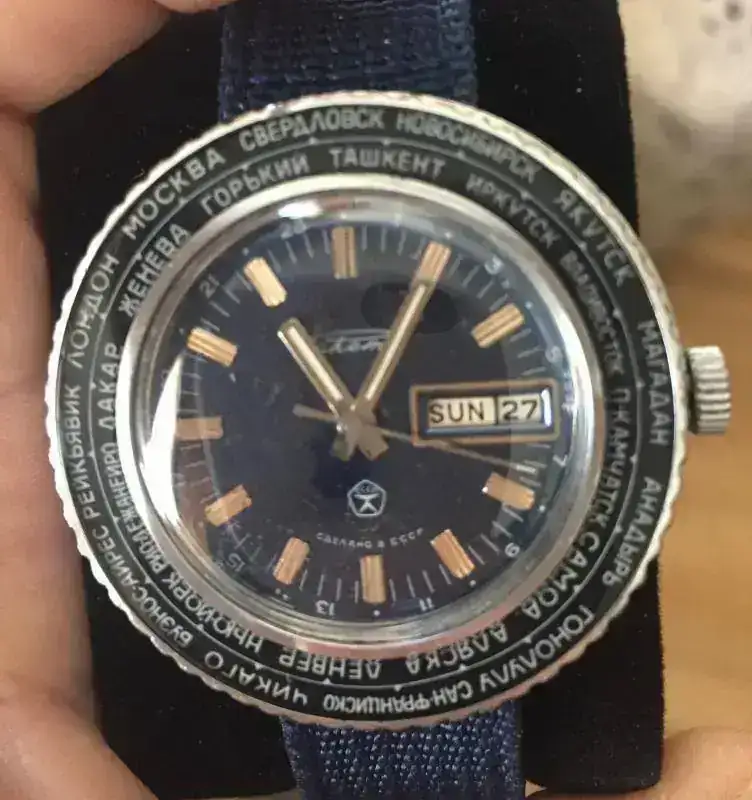 y finalizo con un ejemplar que aunque no esta en la caja y no es un GMT al uso, debo colocarlo aquí, pues es un reloj sovietico de los años 70, el Raketa City Wolrd Time, con un calibre manual 2628 H y un bisel giratorio de ciudades de los 24 husos horarios :