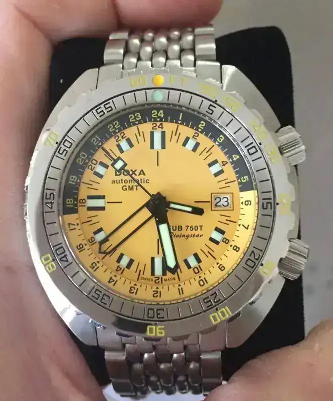 La siguiente marca es ampliamente conocida por su modelos diver : Doxa. Tras su renacer de 2002, en 2014 lanzó una serie única GMT/Diver, el Doxa Sub 750 T GMT Divingstar, alimentada por su calibre GMT también derivado del ETA2892-A2, en una caja de 75 ATM de resistencia al agua y doble corona con bisel interno de 24H. Sin olvidar el Bisel con tiempos de descompresión exclusivo de la marca :