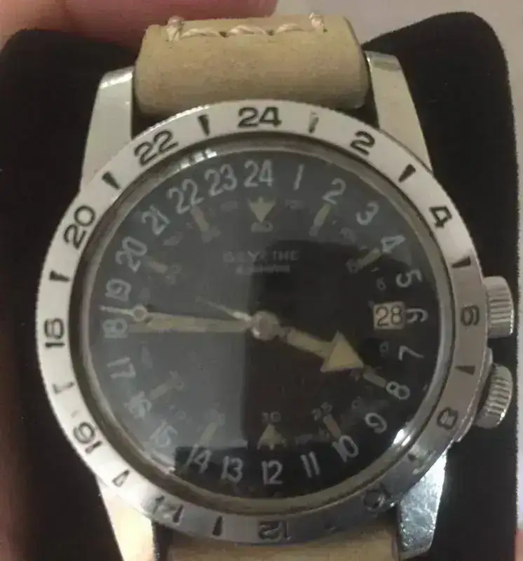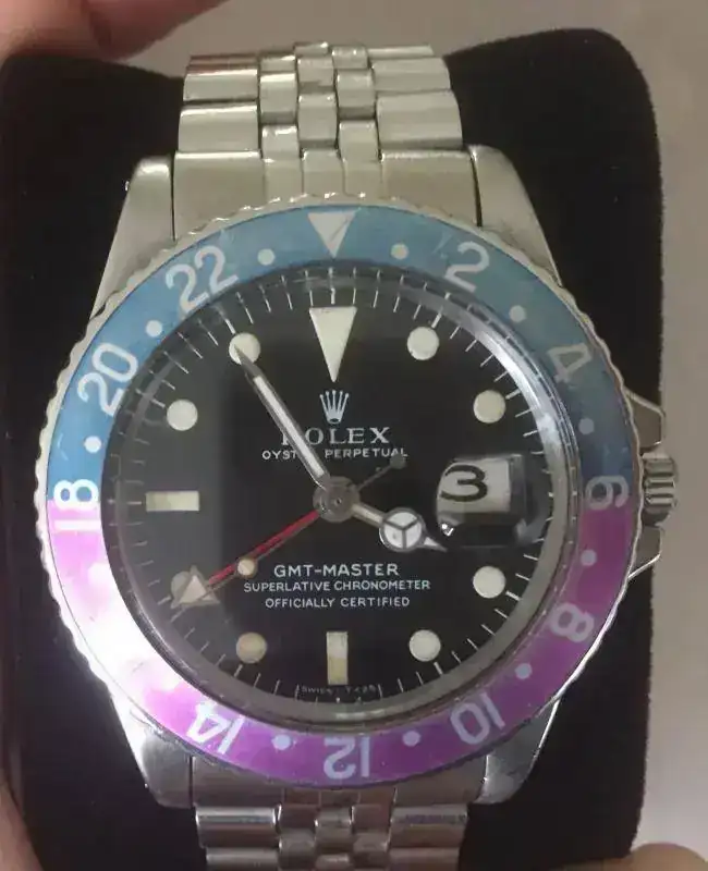 En 1954, es Rolex quien desarrolla su modelo GMT Master ref. 6542 para equipar a los pilotos de la linea comercial Pan Am. Este si es un GMT "puro", con aguja horaria normal y otra segunda 24H. Incorporaba un bisel giratorio 24H de baquelita, bicolor "Pepsi" en la versión acero (rojo para el día y azul para la noche) y totalmente marrón en la versión de oro. En 1959, se sustituye por el modelo GMT Master 1675. La unidad presentada, y conocida por algunos miembros del Foro, es un 1675 MK1 "Long E" de 1970-71, con bisel Fucsia, que llevaron algunas unidades finales de los diales Gilt y primeros de los Mate: