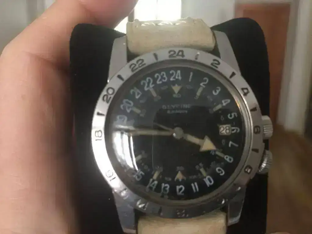 Paralelamente, en los años 50 comienzan a realizarse los vuelos de larga distancia que atraviesan diferentes husos horarios, surgiendo la necesidad para pilotos y pasajeros de conocer la hora en zona de salida y hora de llegada. El primer encargo de este tipo se realizó en 1953 a Glycine, y nació el modelo "Airman", que en los primeros años llevaba calibre FELSA 692N Bidynator con dial 24H y un bisel giratorio también 24H. Este reloj es para unos el primer GMT de la historia, aunque para otros es un 24H, no un auténtico GMT. Además incorporaba otras dos novedades, una segunda corona que bloquea el giro inadvertido del bisel y un gancho que bloquea la aguja segundera al extraer la corona y permite la perfecta sincronización de varios relojes. Esto le convirtió en uno de los relojes preferidos por los pilotos de combate en las Guerras de Corea y Vietnam. El modelo presentado es un MK1 de 1953-54, con los característicos triángulos en el dial a las 12 y 24h: