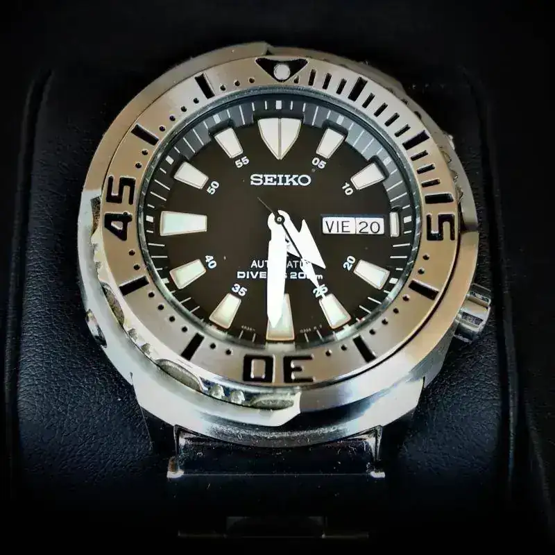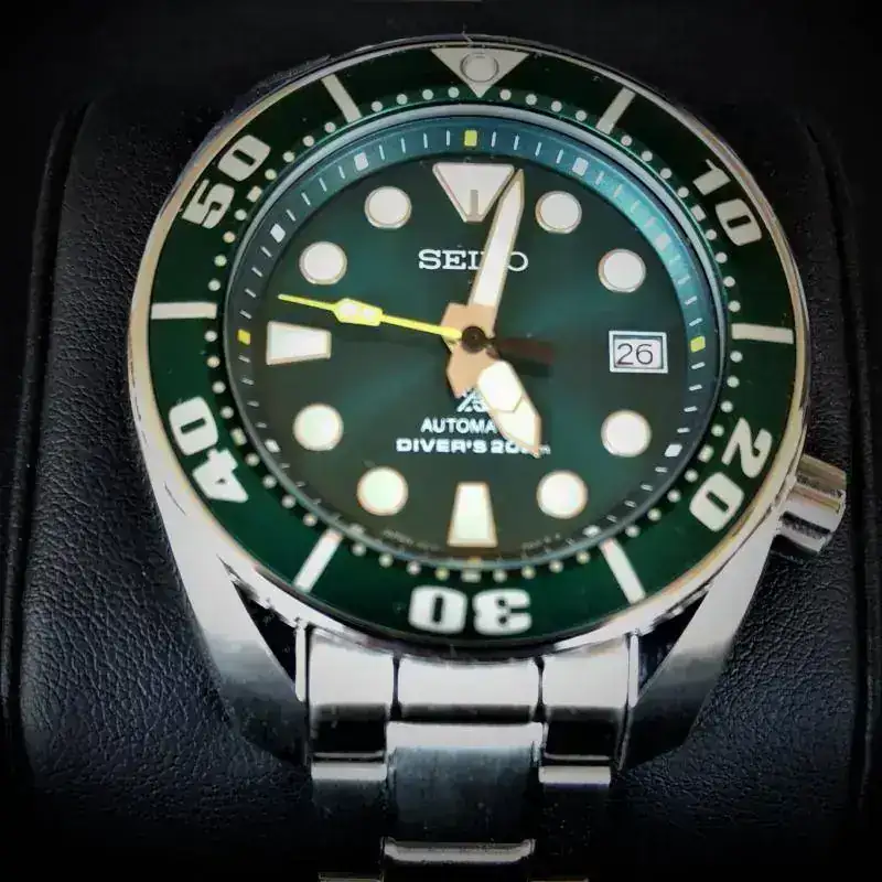 El tercer y último Seiko es actualmente el niño mimado de la caja, ya que ha llegado hace escasas semanas. Hace años que quería un Sumo y no sé muy bien porque siempre terminaba pasando otro por delante. También hace tiempo que quería probar con un verde, así que cuando se presentó la ocasión de adquirir un Sumo Emerald a buen precio, de cabeza me tiré y lo cierto es que estoy muy contento con él. Destacar su dial y bisel, que pasa de un verde oscuro discreto, a un verde sorprendente cuando le da el sol, un día me la pego conduciendo...