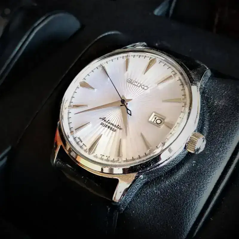 El segundo Seiko es un "Cocktail Time" de los primeros. Prácticamente no me lo pongo nunca y eso que voy a diario con traje y corbata (cuando veáis toda mi colección veréis que mis gustos van claramente por otros derroteros), pero sin embargo me resisto a que salga de la caja ya que me encanta contemplar ese dial aunque sea simplemente en la caja.