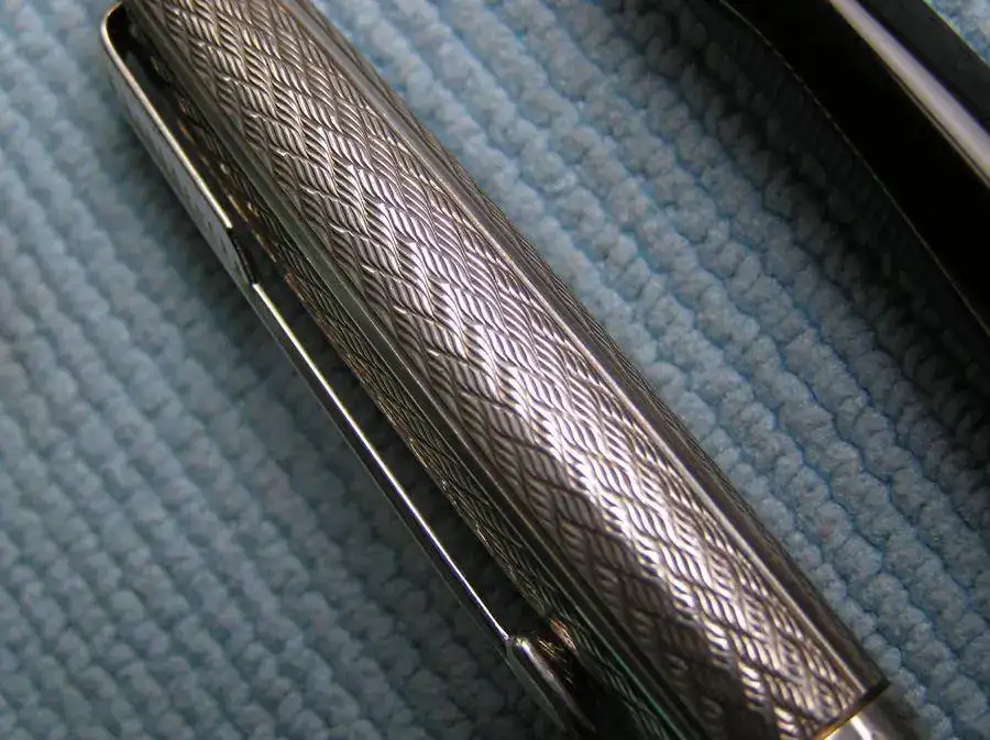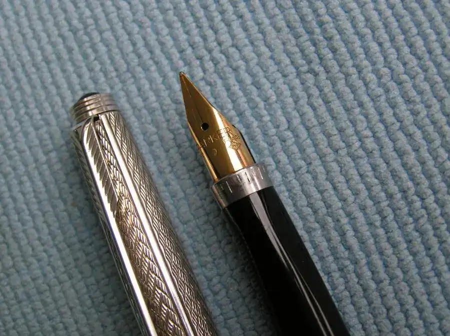 Lleva también un cabuchón negro en lo alto del capuchón que solo llevan los modelos en plata. El clip es también plateado. El plumín es fino y tiene algo de flexibilidad.