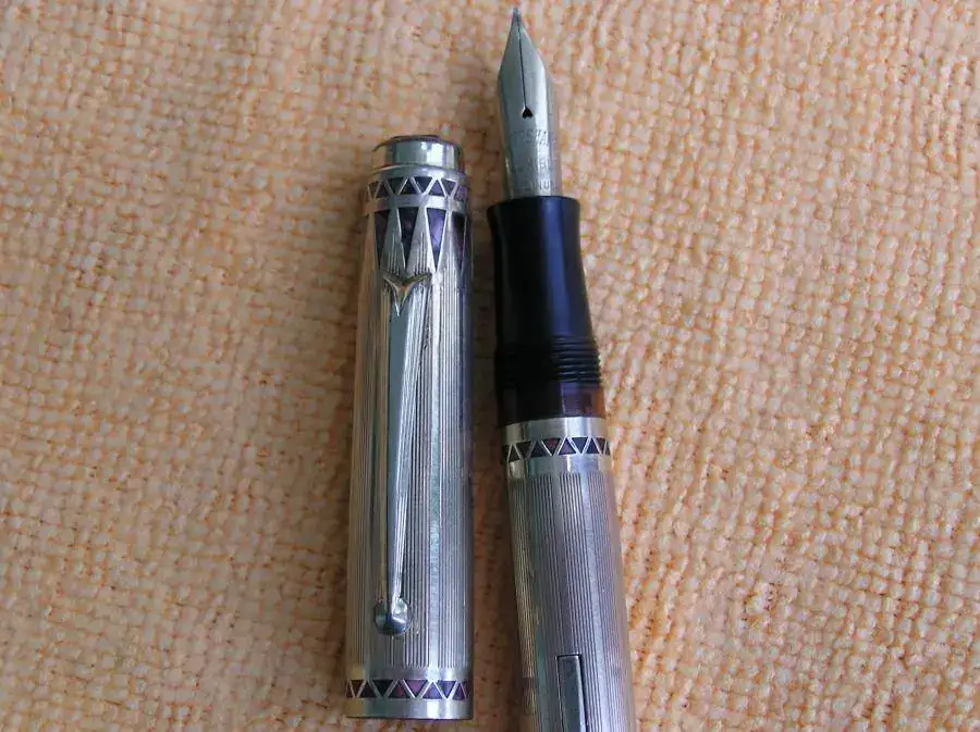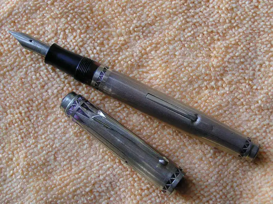 Representa para muchos la cima del diseño Art-Decó aplicado a plumas y su capuchón, con sus insertos de plástico Pyralin en color rojo dubonnet como la que presento, o negro, recuerda la cima del edificio Chrysler.