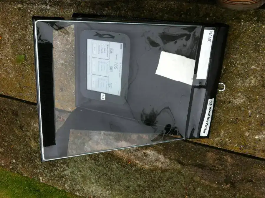 Y los ayudantes de los árbitros utilizamos una especie de PDA para enviar las puntuaciones y este año nos han dejado algo muy curioso que me ha llamado mucho la atención y que me ha hecho pensar en vosotros; en los que usan las plumas dentro y fuera, con sol, agua, nieve y/o lo que caiga a riesgo de que la tinta empiece a moverse a su libre albedrío por el papel. Ya es difícil escribir con bolígrafo bajo la lluvia, con pluma no digamos.