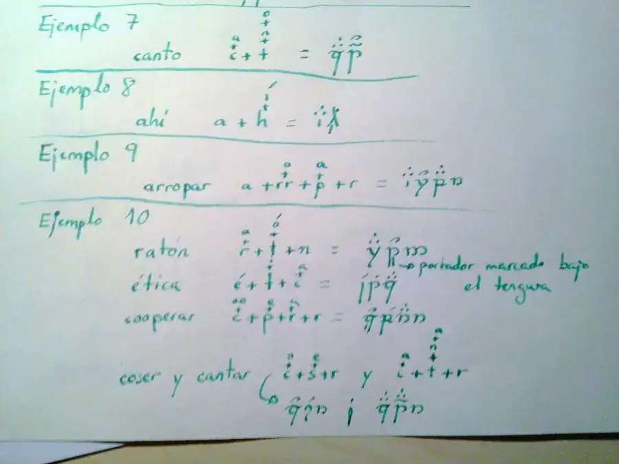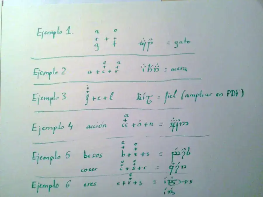 Lo principal, es que se escribe teniendo en cuenta las consonantes y las vocales, en el orden de aparición. Y a cada consonante, se le superpone la vocal que la sigue. Por ejemplo, en la palabra gato, a la g se le superpone la a, y a la t, la o, formando así dos “dibujos”: la g con los tres puntos de la a sobre ella, y la t con la curva a la derecha sobre ella.