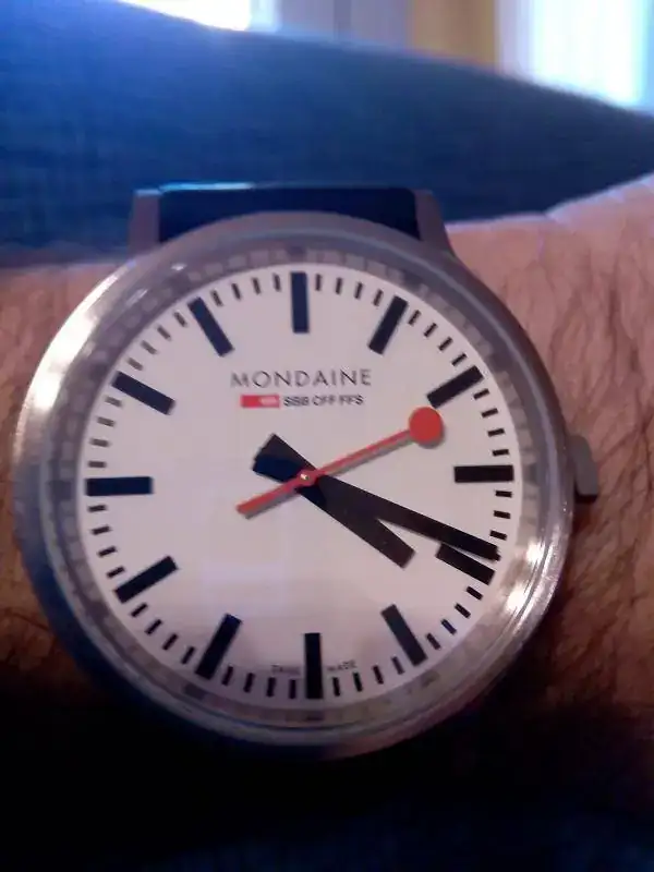 Saco a la venta este Mondaine Stop2go con un diseño industrial icónico. El reloj fue diseñado en 1944 por Hans Hilfiker para los ferrocarriles Suizos. Tiene un movimiento con segundero continuo (similar al automático) que se para cada minuto a las 12 durante dos segundos. En esos dos segundos, la minutera da un golpe seco, para que así se visualice mejor el paso del minuto, imitando el movimiento que hacen los relojes en las estaciones suizas para sincronizarse.