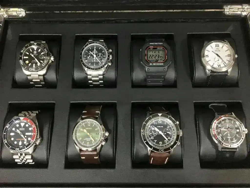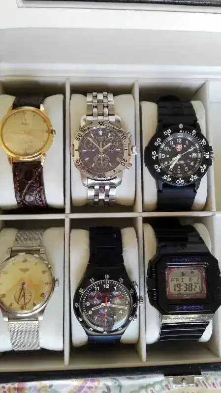 Bueno, confieso que empieza a darme algo de rubor llevar en el foro un montón de años y no haber enseñado nunca mis relojes. Cierto es que es una colección pequeña y sin grandes alardes, pero son los que tengo y a mi me satisfacen plenamente... además me encanta ver vuestras cajas y considero justo poner la mía. Cuando me llegue la última adquisición consideraré cerrada definitivamente mi caja puesto que no quiero tener más relojes de los que pueda disfrutar regularmente. El que espero incorporar a finales de año será un reloj formal de diario: estoy entre un Tissot Le Locle y un Hamilton Jazzmaster o Valiant, ya veré.