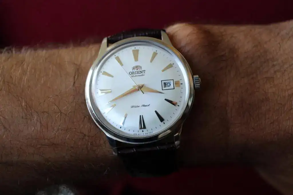 ORIENT FER24005W0 aka "Bambino": Calibre aut. 48743, 30 metros, 40,5mm sin corona, 46,5mm entre asas, 12mm de altura, 65 gramos. Un reloj que pese a su escaso valor, se puede llevar perfectamente a cualquier evento que lo requiera sin que desentone. Para mi gusto, un diseño precioso, si en vez de Orient pusiera por ejemplo Longines en el dial sería un clásico (y de paso mejoraría lo único que no me gusta a nivel estético, el logo). La belleza de la sencillez.
