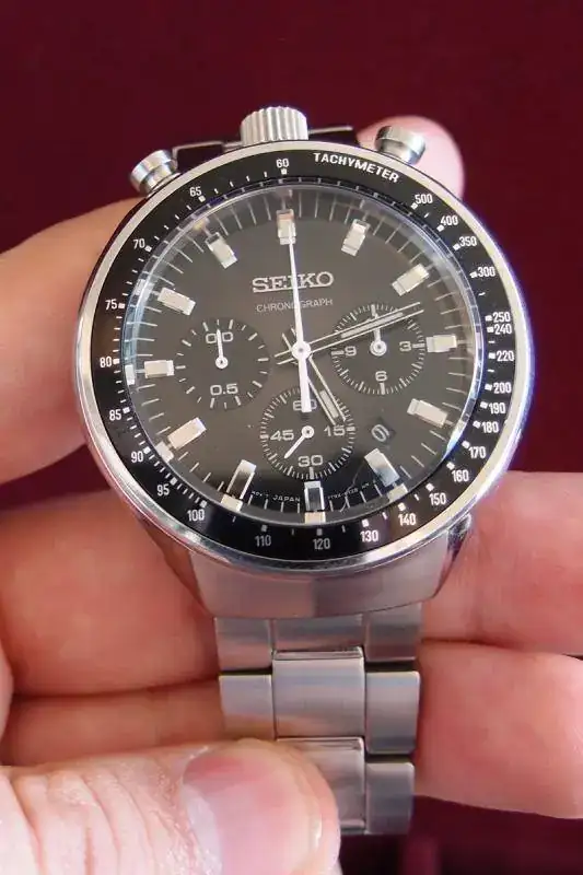 SEIKO SCEB009 aka "Bullhead": Cuarzo 7T92, 100 metros, 41mm de bisel, 43mm de caja, 45mm entre asas, 12,5mm de altura, 130 gramos de peso con armis (20mm) ajustado. Un modelo que homenajea a los maravillosos cronos automáticos de los 70 y que es difícil de conseguir ya que se comercializó sólo para el mercado japones. Una preciosidad con sus característicos pulsadores en la parte superior que facilitaba la manipulación a los pilotos. Si lo hubieran sacado en auto sería ya la bomba, pero entonces seguramente no habría podido comprarlo...;-)