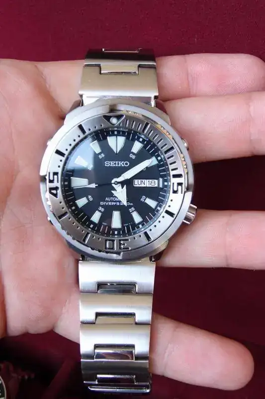 SEIKO SRP637 aka "Baby Tuna": Calibre aut. 4R36, 200 metros, fondo ciego, corona roscada, 42mm de bisel, 47mm de caja sin corona, 51mm entre asas, 13,5 de altura, peso 180 gramos con armis (24mm) ajustado. Adoro mi lata de atún, lo tengo desde marzo y sólo puedo decir que me encanta, contundente pero cómodo. Estuve dudando entre este y el sumo, y aunque os parezca un pecado me quedo con este (si el Sumo llevara otro armis no lo tendría claro).