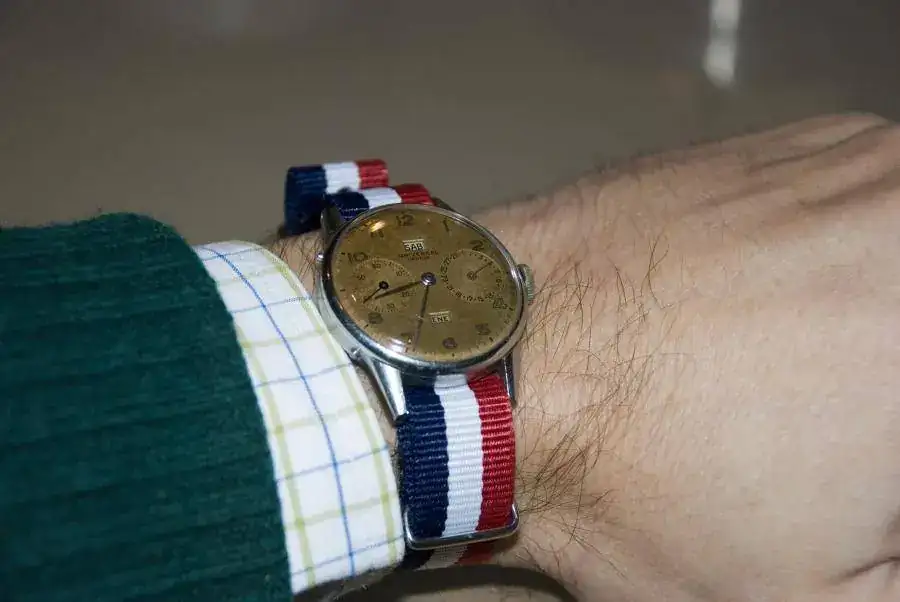 Sinceramente una correa de piel más clásica,le iría mucho mejor.Estaba pensando darle una vuelta al que es hasta la fecha mi única pieza, un Universal Geneve de los 40 que perteneció a mi abuelo y ha pasado esto...