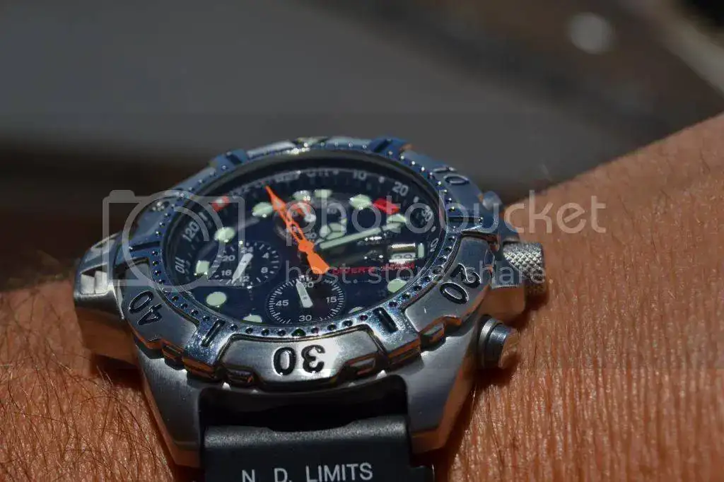Aquí lo teneis el sábado, antes de la inmersión, junto a las botellas con Nitrox (aire enriquecido con oxígeno) que utilizamos. Durante unas inmersiones, sustituirá al Aqualand I. No es que necesite un profundímetro, porque ya llevo los ordenadores, pero tengo ganas de probarlo más veces, a ver que visibilidad tiene bajo el agua.