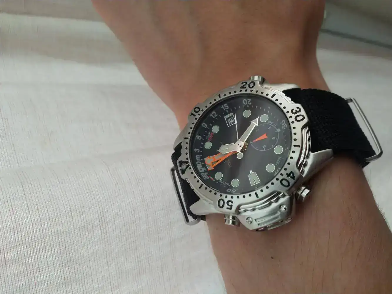 Yo andaba hace ya tiempo indeciso, me atraia mucho el ya mas que clasico,Citizen Excalibur, echando el otro dia un vistazo por internet,siempre habia visto los mismos modelos,una version con armis bisel negro y dial negro y la version con bisel blanco/negro y con correa,algunos con la correa naranja y otros con la correa negra de caucho,pero como ya digo,fue un flechazo a primera vista, una edicion que jamas habia visto antes,que me llamo tanto la atencion,que no pude resistirme con el dial azul las agujas color blanco y azul y el bisel bicolor azul/blanco el caso es que me quede prendado,asi que estoy a la espera de que me lo manden,lo pedi a una pagina italiana,lo tendre a principio de septiembre espero.