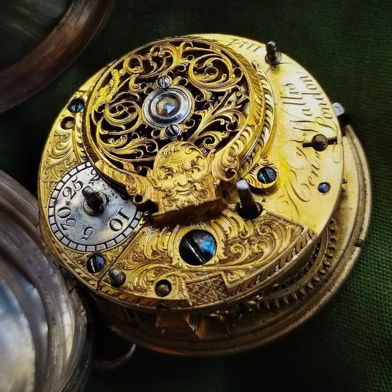 Es un reloj con un dial limpio, muy legible y elegante. Lo primero que me llamó la atención, fue que está equipado con segundero central y os puedo asegurar que se ven muy poco ejemplares de esta firma con esta "complicación". Por su nº de serie, debió ser fabricado en 1860/1 y equipa uno de los mejores calibres que se podían fabricar en su momento. Si os fijáis el dial también lleva la inscripción "AD Fmsz" que no es más que un criptograma que significa 1850, fecha en la que Frodsham diseñó un nuevo calibre, que le hizo ganar la medalla de oro en la exposición internacional de Londres de 1851. Este criptograma solo lo lucían los mejores relojes de Frodsham. Veamos su calibre...