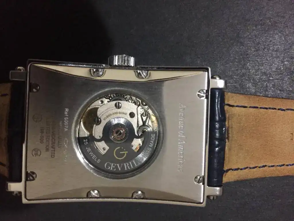 Hola a todos, solicito su ayuda pues me ofrecen un reloj Gevril Avenue of Americas 5007A como cambio por un Tissot PRS516 crono automático. Eso ya me suena un poco generoso de parte del interesado, he revisado en Amazon y en Ebay y veo que es un reloj que se vende sobre 3000 euros. He revisado todas las fotos que he podido y también he buscado "fakes" pero la verdad es una marca que no se ve mucho. Las fotos que tengo (pues no he visto el reloj en persona) se ven bien pero la máquina que va vista en estos relojes si difiere de otras montadas en relojes que se anuncian en la red. Pues no se mucho de movimientos pero me parece que tiene una ETA 2824, lo digo por la forma que tiene el nucleo del rotor. Ahí está mi duda pues hasta donde yo sabía la casa Gevril no utiliza moviemientos ETA.
