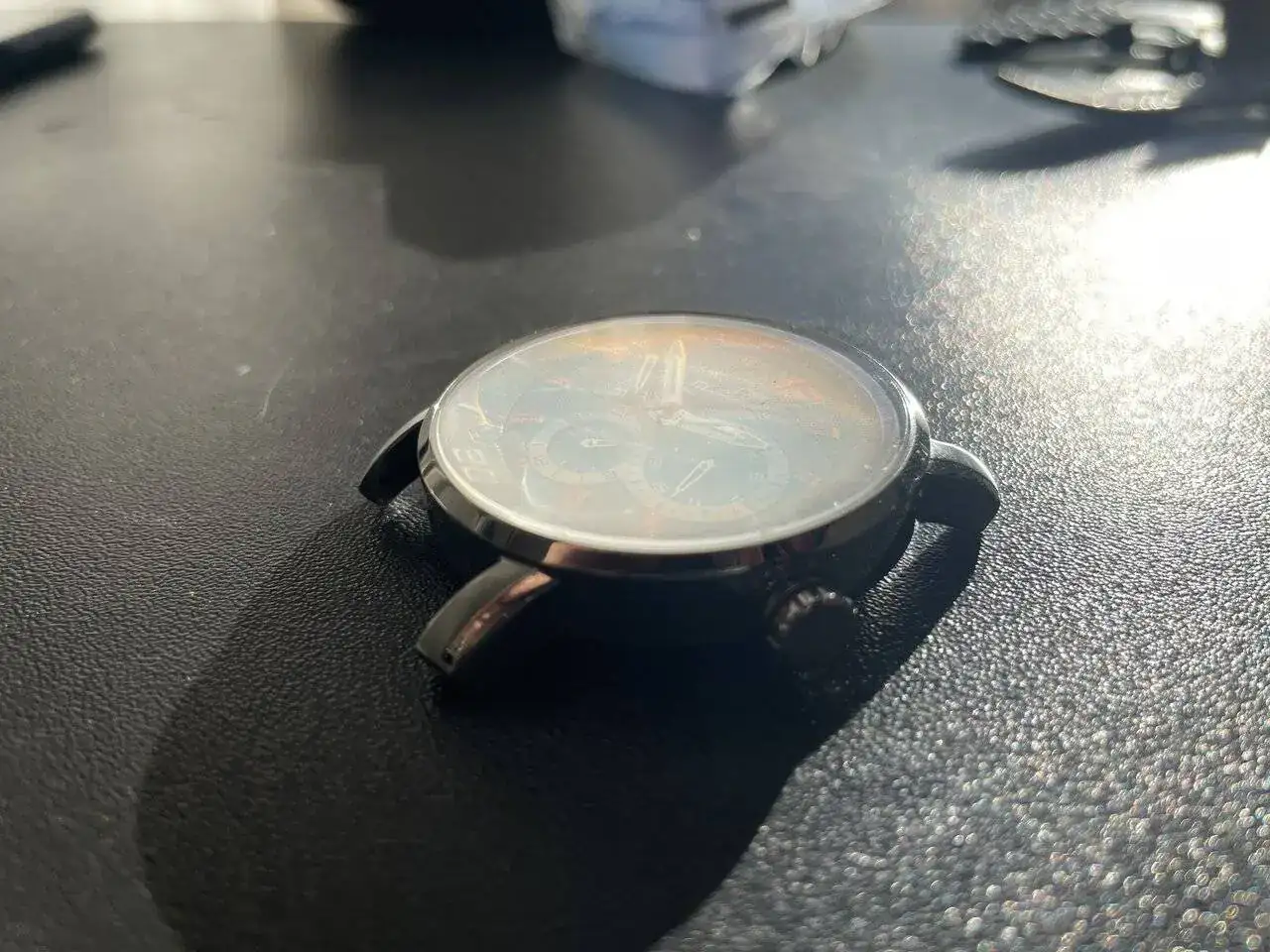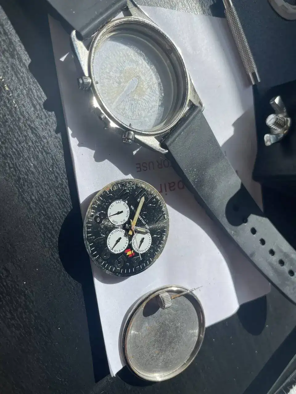 2. Viceroy: por otro lado está el Viceroy, posiblemente lleve 15 años en este estado (cuando lo desmonté, la pila estaba un poco abierta y causó ese óxido/suciedad). Por otro lado, no sé si se aprecia bien, pero la esfera tiene una especie de marca, la cual he intentado limpiarla con agua caliente y un bastoncillo y no hay manera a quitarla. ¿Sabéis de alguna solución para ambas cosas?