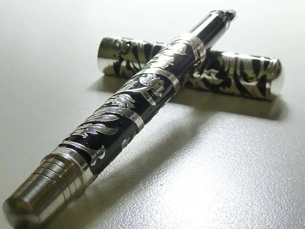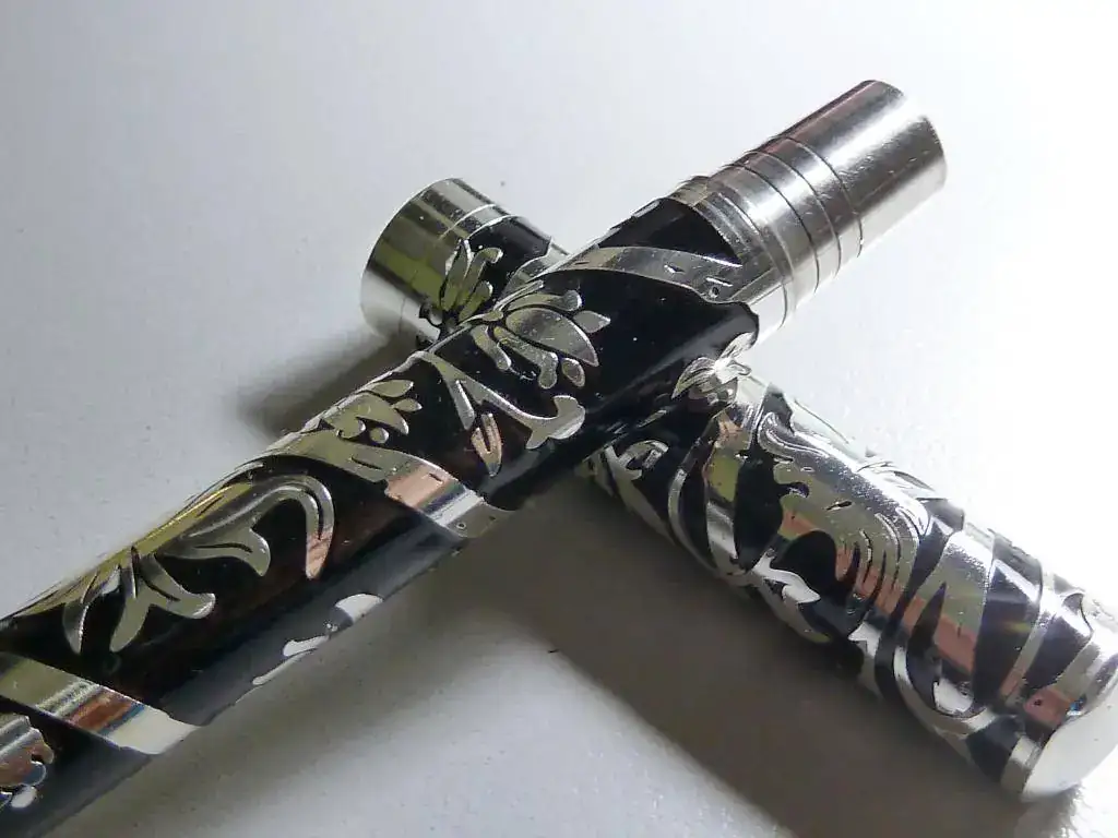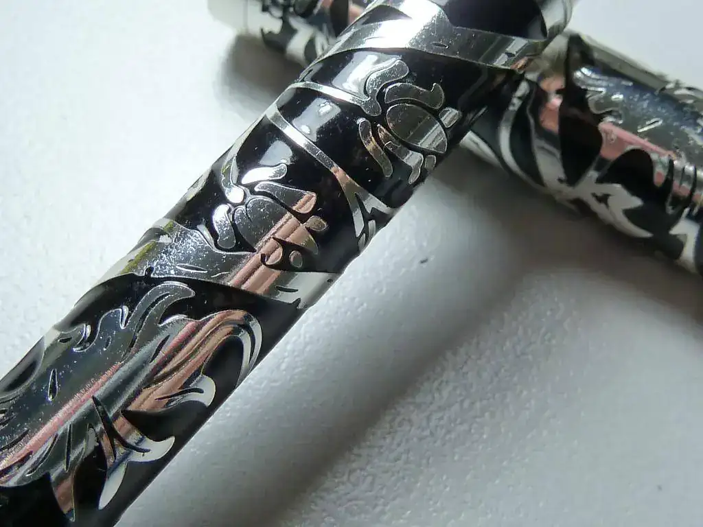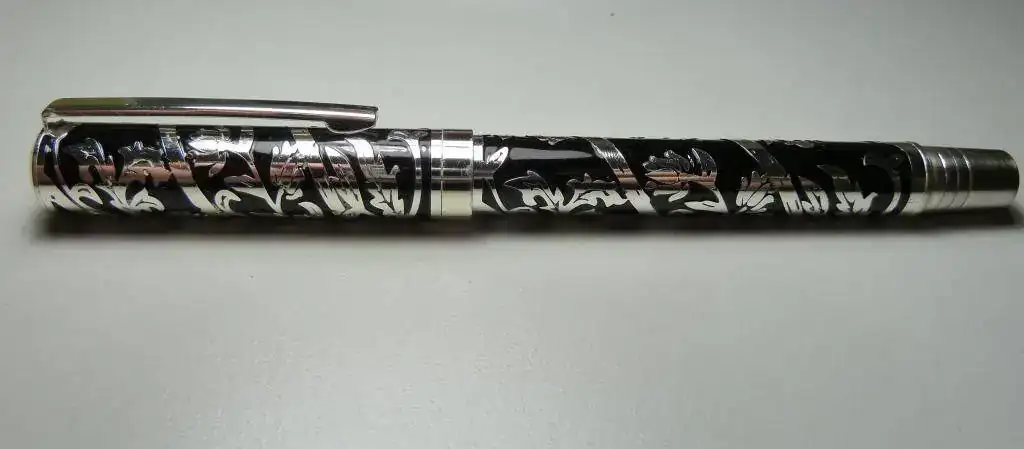 Hace años, unos diez, mucho antes de mi interés por las estilográficas, me regalaron, unas personas especiales, esta pluma que os muestro. No tengo la caja y no sé que marca ponía en el estuche. En la pieza no hay ni nombre ni referencia. El culote tenía una especie de plástico transparente que elimine y luego lo lijé un poco. El clip y el top del capuchón y el aro inferior del capuchon son distinto material al del metal incrustado. Estoy convencido que fue comprada en librería de barrio, más como detalle que como objeto de valor. Sé que es es gente que me estaba muy agradecida. El caso es que revolviendo cajones me ha aparecido en una caja de Inoxcrom. La he limpiado y el metal ha recuperado un brillo y una lozanía muy agradable. En las fotos veréis unos pequeños puntos que seguro son restos del polywatch ya que hice las fotos pocos instantes después de limpiarla. Dejando claro su escaso valor económico resulta que la pluma me parece muy bonita. Los apliques de metal sobre la resina han creado unos dibujos interesantes. ¿Cómo hacen para que no se caigan las tiras del metal? No da la sensación de estar pegadas al plástico. ¿Qué metal puede ser? Descarto la plata ya que no creo que esas personas gastaran demasiado dinero y por el excesivo brillo después del polywatch aunque cuando la recuperé, después de años de olvido, el metal estaba más apagado. Como veis el plumín no tiene ninguna marca. Escribe bien y parece un Smith. Lo que daría por recuperar el estuche original. La pluma me recuerda -salvando las distancias- a esta del youtube que os muestro. Es posible que pueda ser una de las plumas de quiosco por fascículos. De todas formas, no me suelo pasar el día mirando plumas por el ordenador pero tengo la sensación que este tipo de construcción con metales incrustados no es muy habitual.