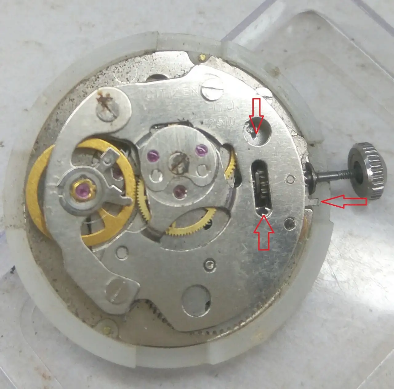 Buenos días, he comprado un reloj en el rastro, se trata de un Citizen con el movimiento 2510 de cuerda (he encontrado muy poca información sobre el por internet). Soy nuevo en esto de la relojería y me gustaría quitarle la tija para poder restaurar la caja, el problema es que he mirado diferentes videos de como hacerlo pero este movimiento debe de llevar otro tipo de sistema y no soy capaz de sacarla. Si alguien me puede ayudar lo agradecería muchísimo, un saludo.