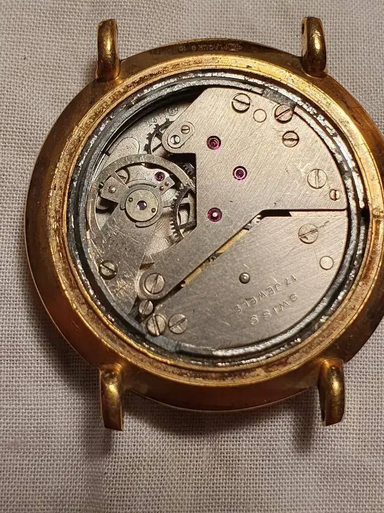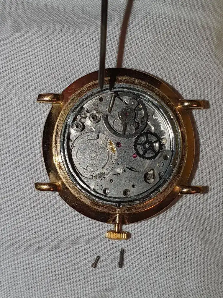 Un amigo me ha dejado un reloj que no funciona. Tenía la corona un poco salida y cuando lo he abierto no he conseguido ni liberar la tija ni ver cómo sacar el calibre. He empezado a desmontar por si veía la solución, pero me he quedado atascado y no sé cómo continuar pues no quiero forzar nada ya que no sé cómo va montado. Tengo dudas de que le hayan puesto pegamento entre la caja y el aro exterior.