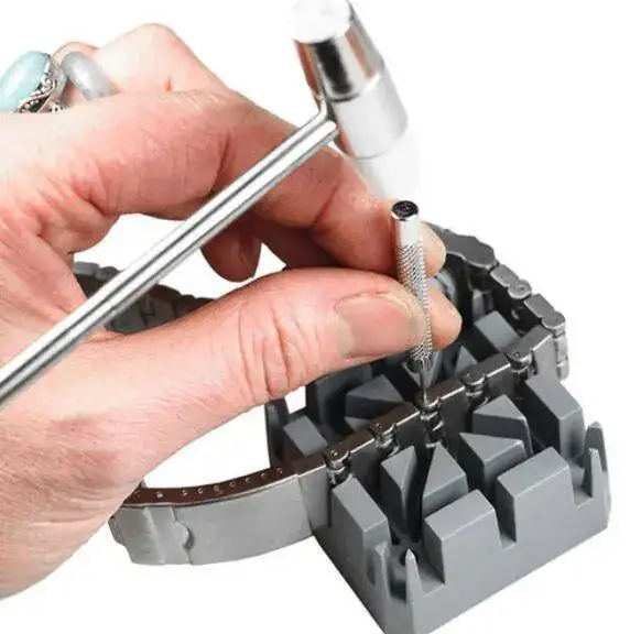 He puesto fotos y el mecanismo es diferente por eso estoy bloqueadoTambién existen unas herramientas consistentes en un martillito especial, unos punzones y una base para poder quitar y poner los pasadores y quitar y poner eslabones. Los eslabones suelen llevar una flechita marcada por dentro y has de sacarlos en el sentido de la misma y meterlos por el otro sentido, vamos no sé si me he explicado bien. La parte de la cabeza del martillo de plástico, te permite picar directamente sobre el pasador al volver a colocarlo, sin marcar los eslabones. Luego se puede acabar de poner bien, mediante el punzón, con un kid de estos baratucho de alliexpress, normalmente va bien.La herramienta del compañero Atkara también va muy bien y la puedes encontrar en Aliexpress: