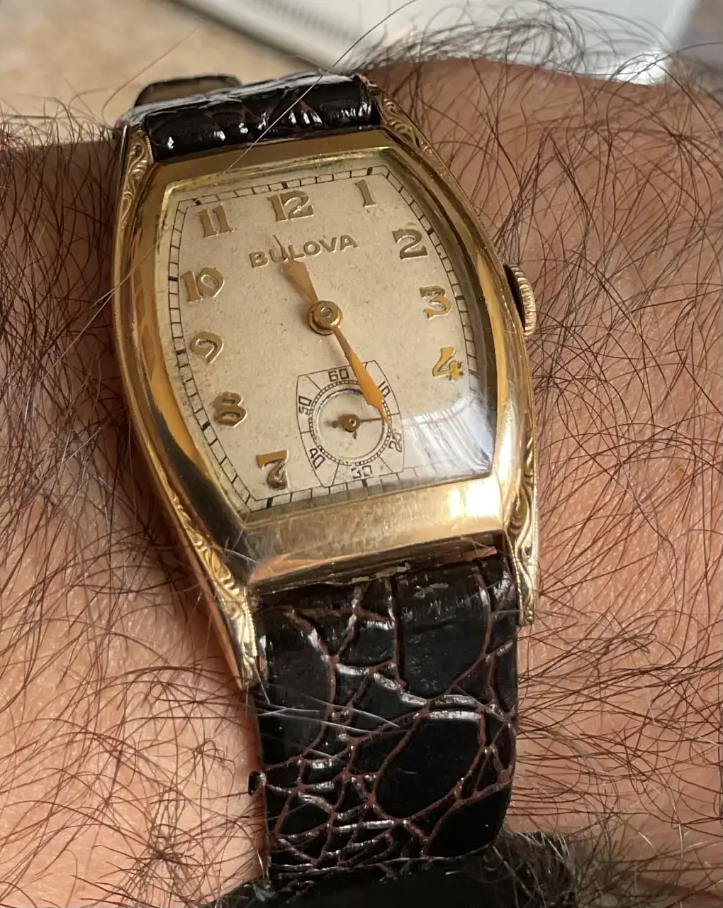 La correa es actual, una original igual se deshacía en las manos… de todas maneras con este tipo de relojes lo de correa original se desdibuja un poco, se servían con distintas correas de cuero, con los famosos brazaletes extensibles (hechos por terceros)… Existir existían hebillas y correas firmadas por Hamilton, pero no sé hasta qué punto eran frecuentes o “de dotación”, hasta qué punto los distribuidores ponían correas y brazaletes…