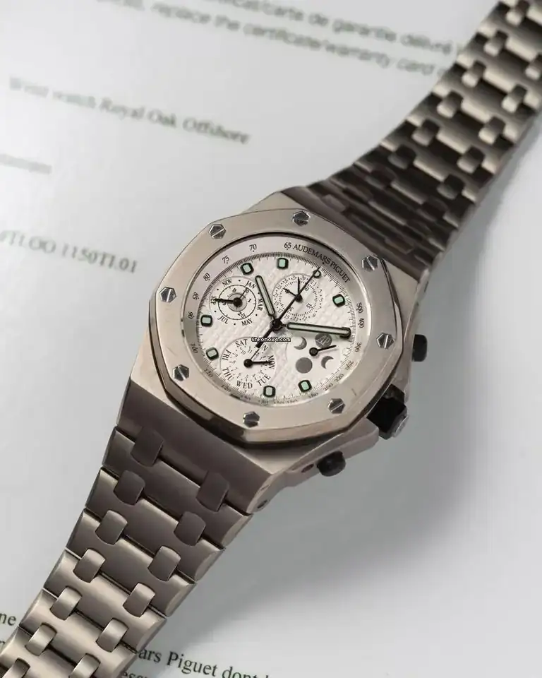 Y el mayor salto fue hacerme con un Audemars OffShore calendario perpetuo y fase lunar de titanio, y a un precio que hoy causaría risa y asombro pues fueron unos 15K hace unos 14 años (jamás había gastado tanto dinero en un reloj)…