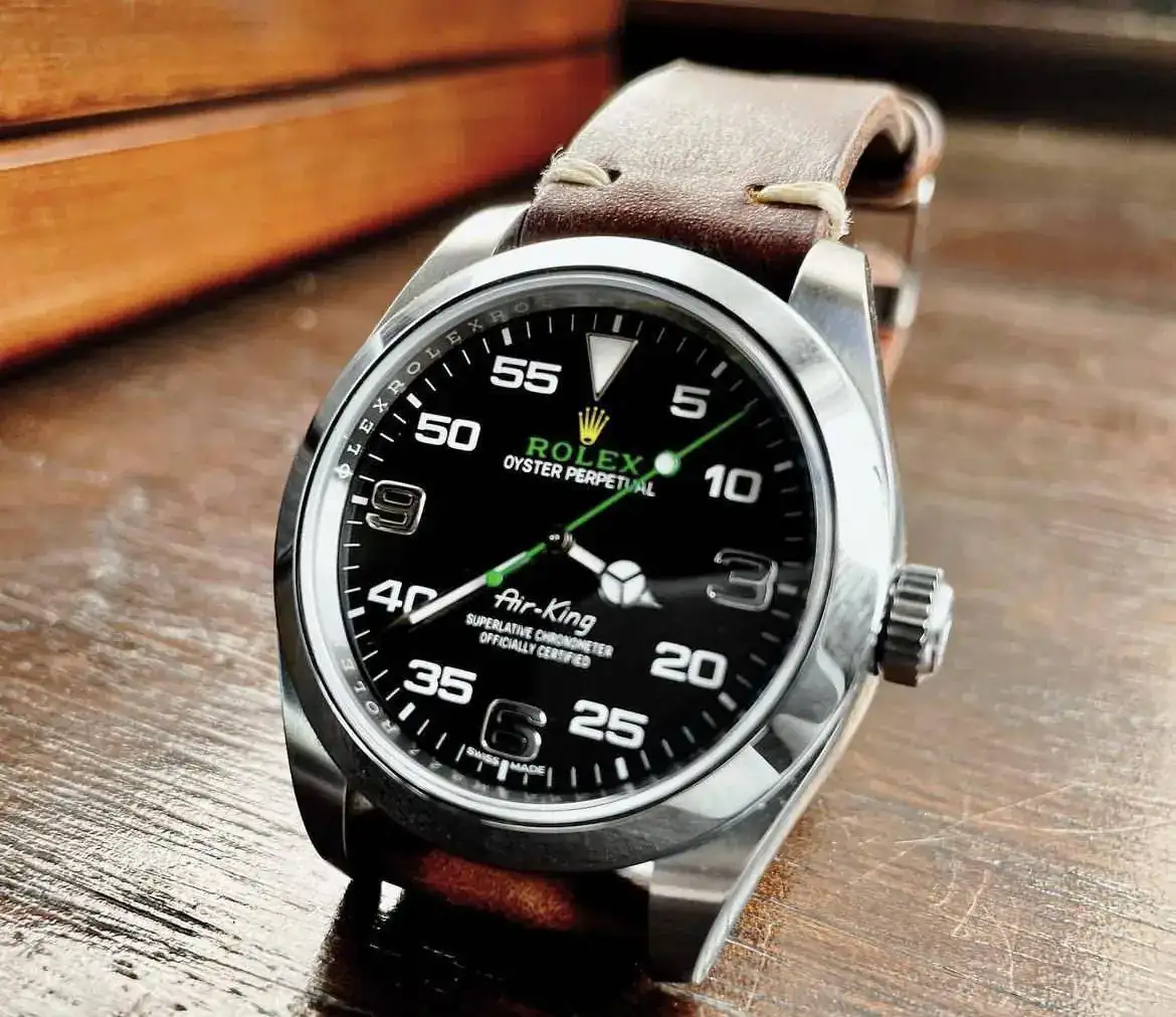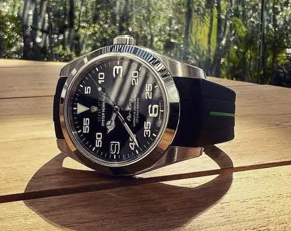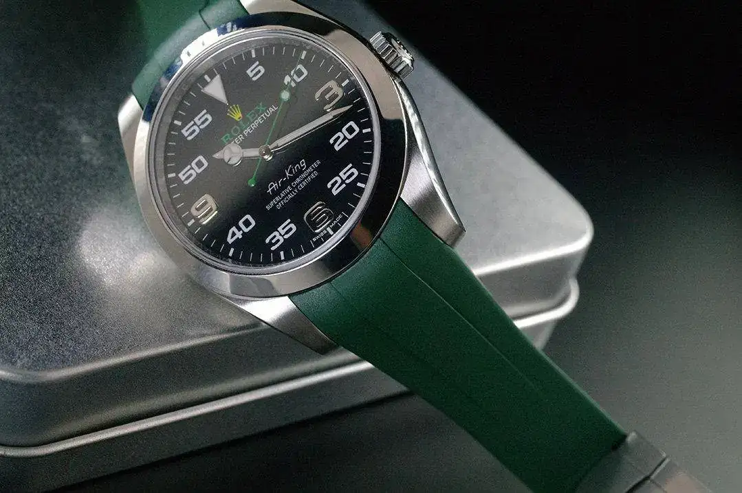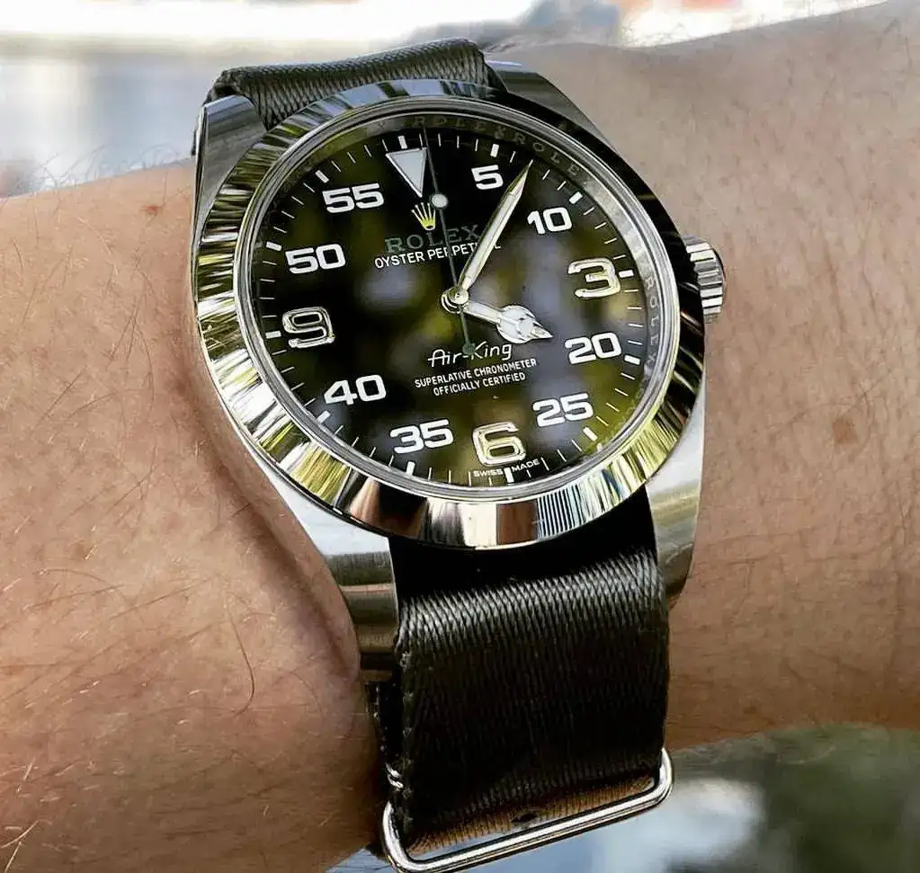 Estoy pensando en sustituir el brazalete metálico del Air-King por una correa, quizá color verde, negro o incluso amarillo. Respecto al material he pensado en primer lugar en cordura y en canvas (la piel quizá reste ese toque informal que estoy buscando).