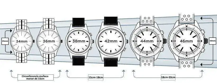 Según la imagen de arriba, el tamaño de reloj adecuado para cada tamaño de muñeca, sería esta aproximadamente: