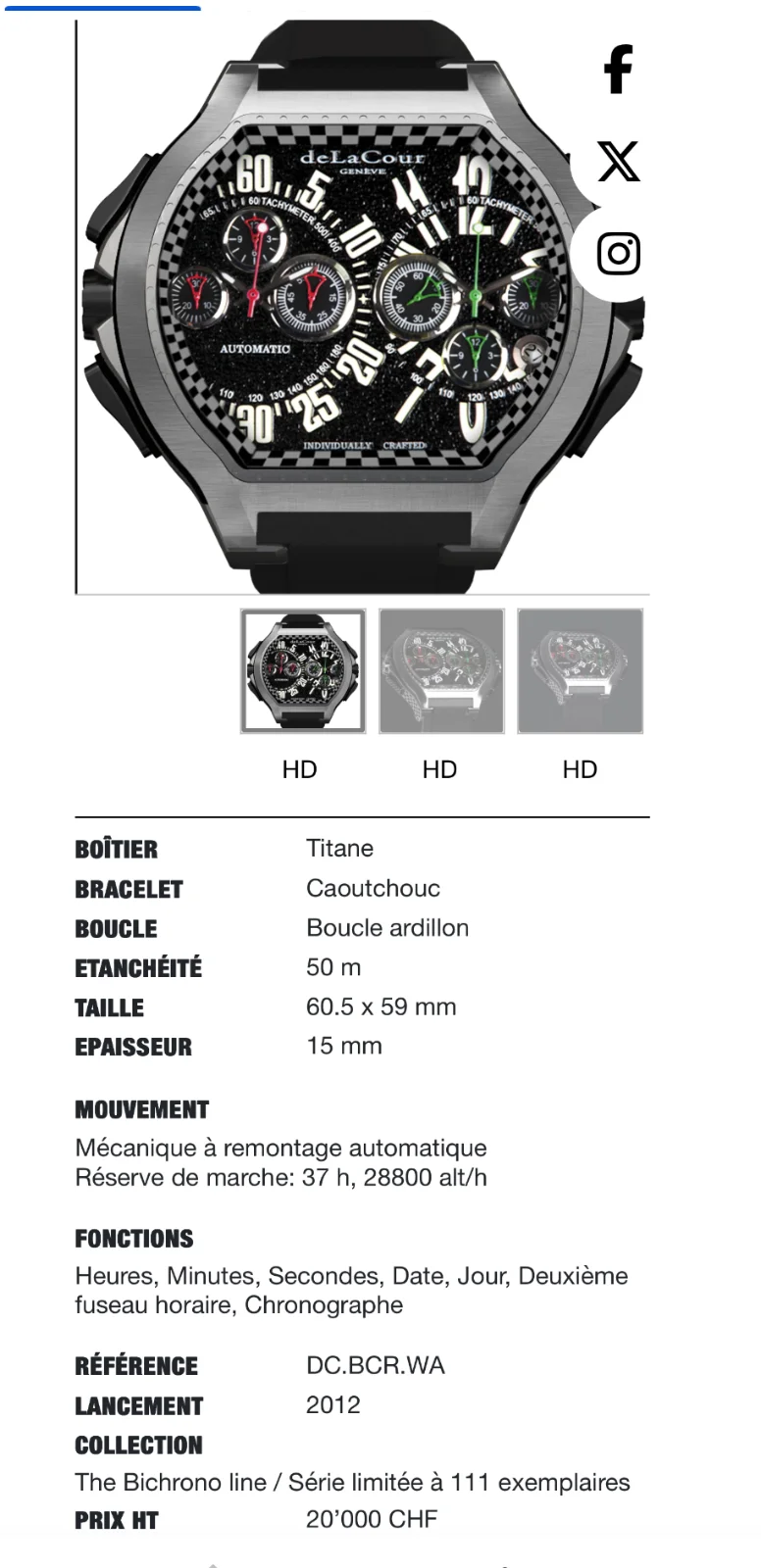 Este por ejemplo, un DelaCour Bichrono que se presentó en el GPHG (Grand Prix D’horlogerie de Geneve) en 2.012. Un reloj antes de impuestos que tenía un precio de 20.000 francos suizos (21.396€) lo que supondría 25.000€ con las tasas y aduanas como poco.