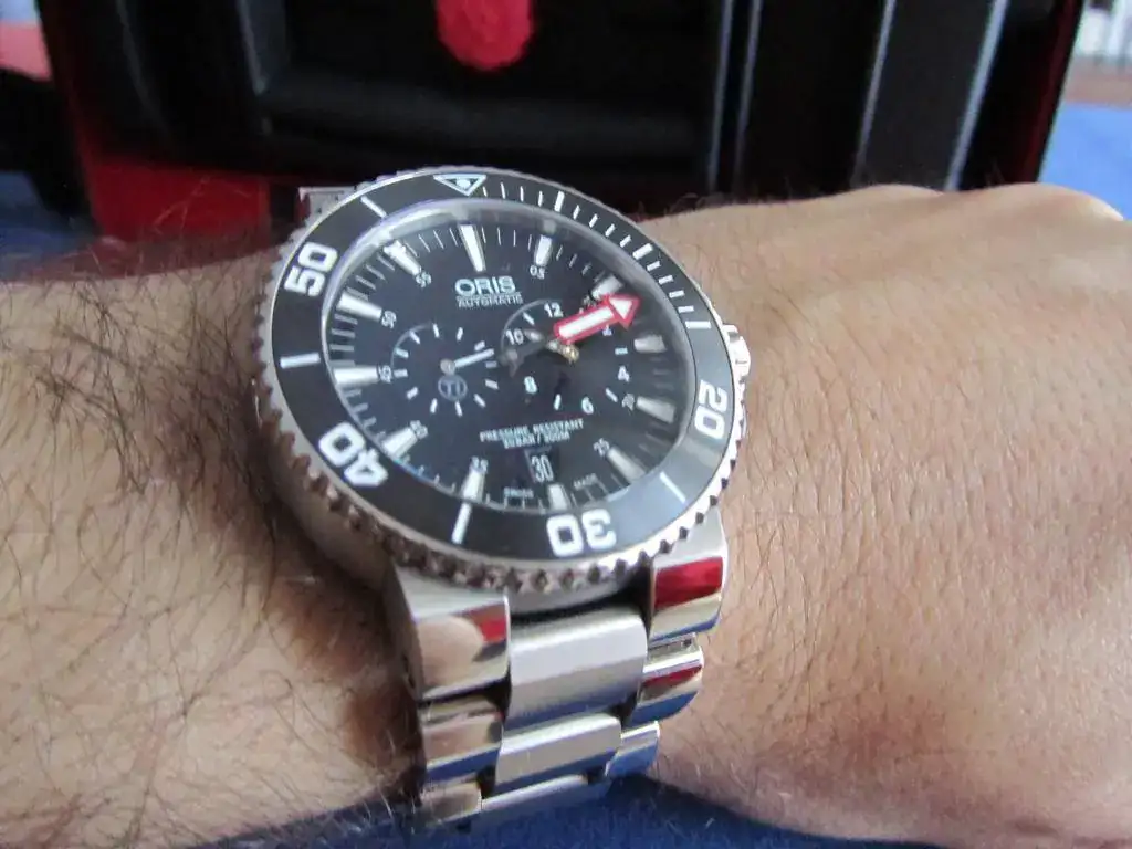 Mi favorito es el Aquis Regulateur "Der Meistertaucher" , por su tamaño (43mm) y fabricación en titanio que lo hace muy cómodo y llevadero. Todo un reloj herramienta con una calidad sobervia acorde a la gama alta de Oris a la que pertenece, con un presentación y dotación impresionante.
