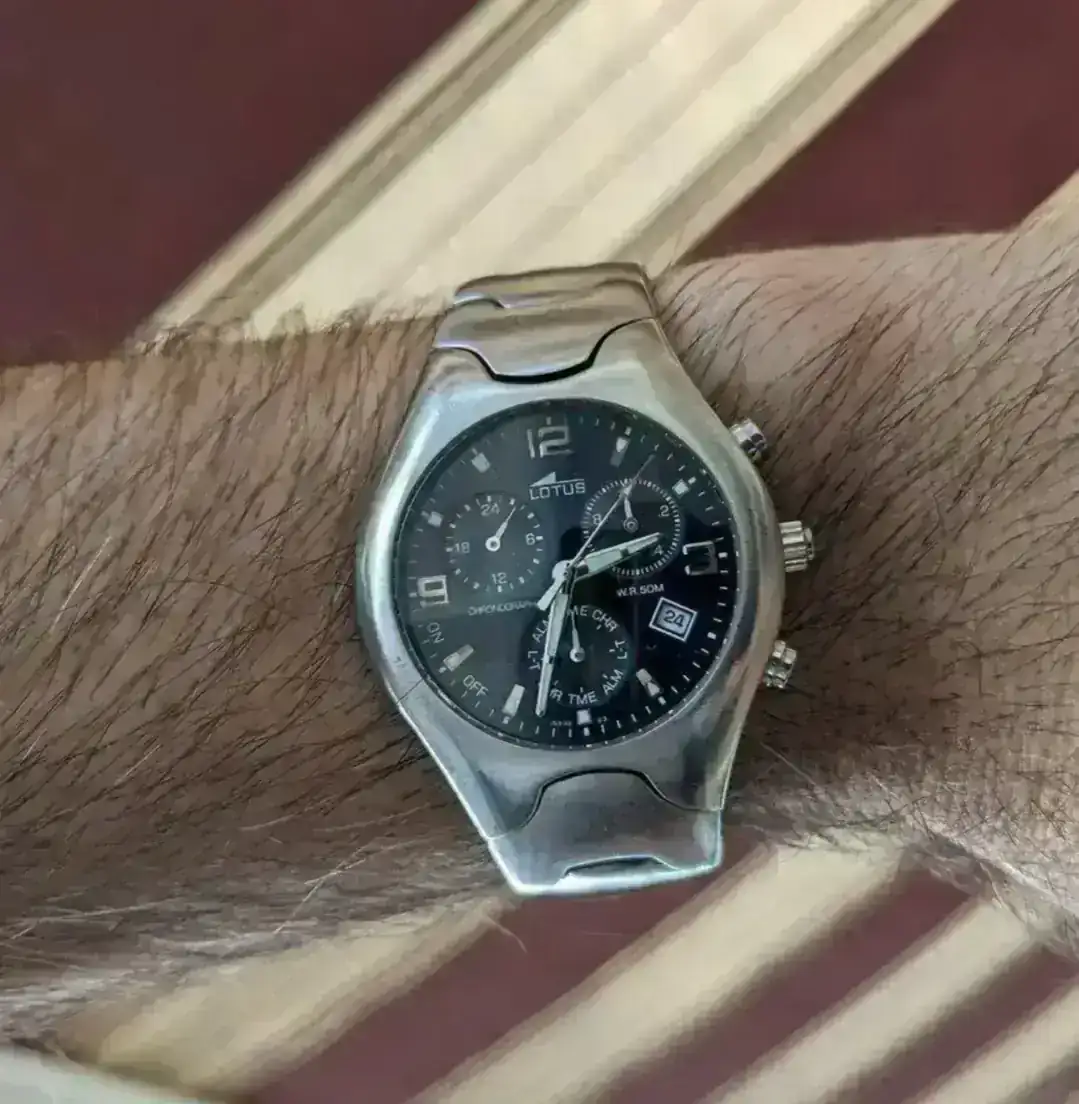 Dejando a un lado varios digitales, especialmente casios. Mi primer analógico, de niño, fue uno blanco con correa naranja que me trajo mi abuela de Canarias. Pero no recuerdo la marca ni que fue de él. Hace ya muuucho tiempo, contaba yo 20 años, mi pareja me regaló este crono lotus:
