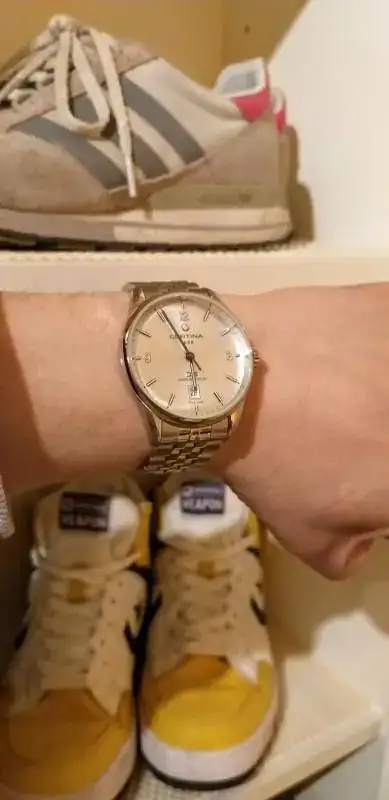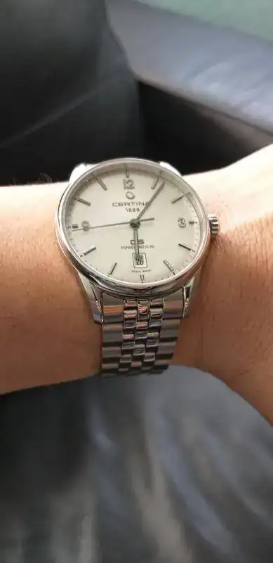 En cuanto al Certina, no sé que me pasa con el. A veces no me gusta, a veces si, me enamora... y mucho. Es todo plateado, con armis estilo jubilee, de una calidad impresionante, la aguja segundera se mueve mejor que la del Oris Aquis Date, es una joya, una joya. Ahora lo tengo puesto, y alucino.