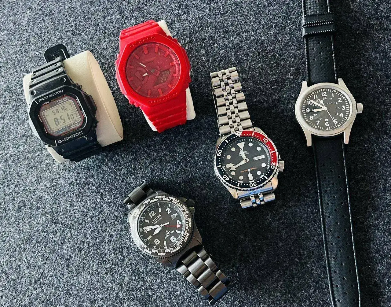 En mi caja conviven relojes de 30 euros con un cuarzo cutre en el interior con cuarzos de calidad, mecánicos, automáticos y solares. Claro que me he juntado con un número muy elevado de ellos, ¿soy el único? O hay más que tengáis más de 20-30 relojes?