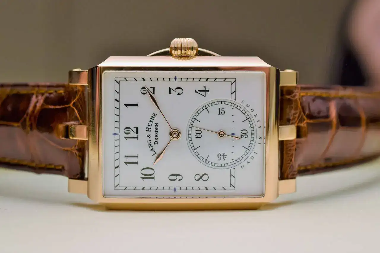 Entre otras muchas cosas, que ya contaré del sensacional modelo, de las curiosidades del diseño rectangular pero visualmente cuadrado de su dial, de la independiente semidesconocida pero alabadísima marca en la zona horológica por excelencia de Alemania, de sus magníficos fundadores que le dan nombre, de su exclusiva producción a medida de dos dígitos anuales y de su artesanal fábrica totalmente autosuficiente, lo de “Made in Saxony“ y lo de “Dresden“ me parece la pasada. Como referencia geográfica y horológica la famosa nominación Glashütte es como un pueblo de Dresde (está a 30 km de la ciudad) que a su vez es la capital de Sajonia.