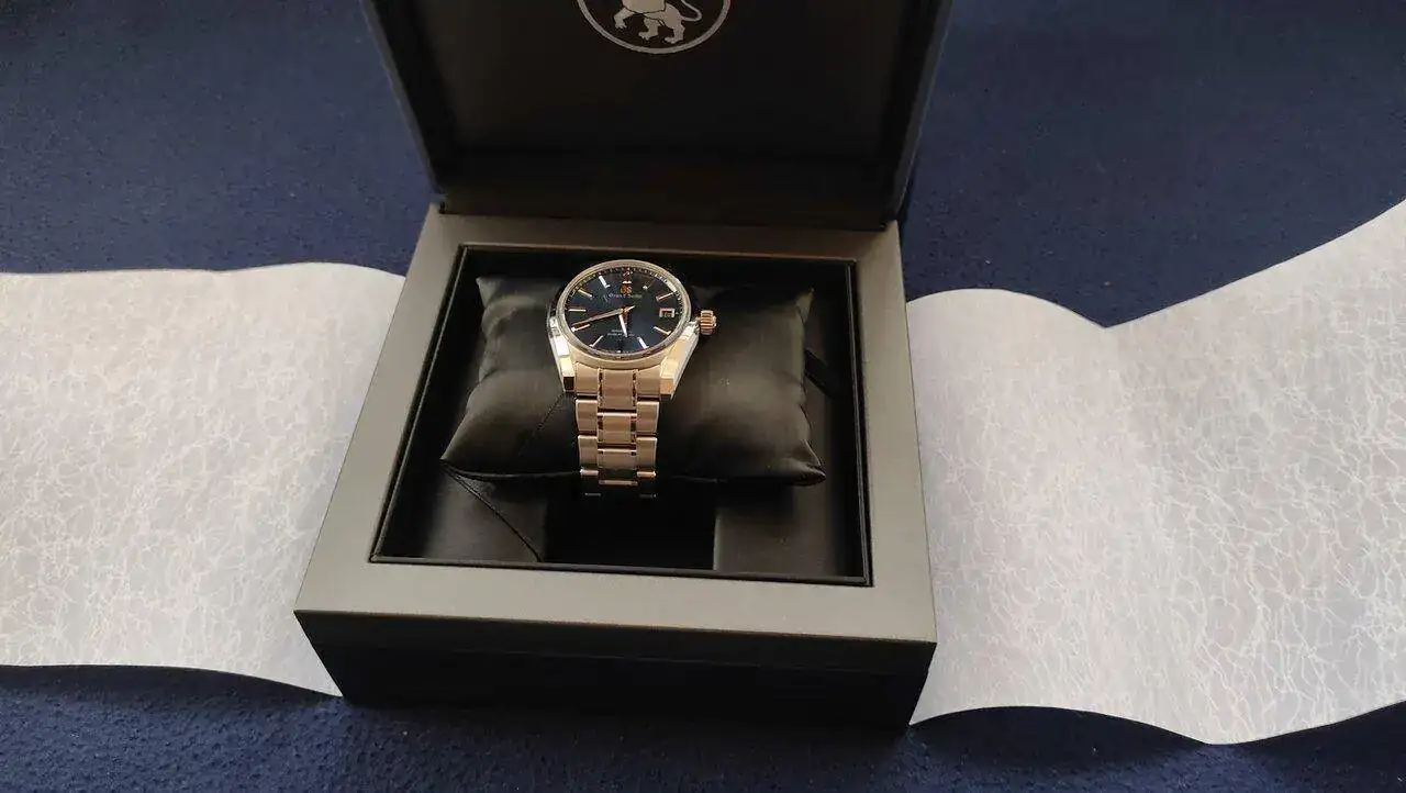 Me he pasado años viendo fotos, vídeos y reseñas de esta pieza. He esperado durante 5 años poseer lo que para mi se ha convertido en un grial. Los acabados de índices radiados, aguja segundera (con cañon oculto), logo dorado, pulido de caja espectacular, y una caja sin bisel totalmente diferente a lo visto. Es espectacular.