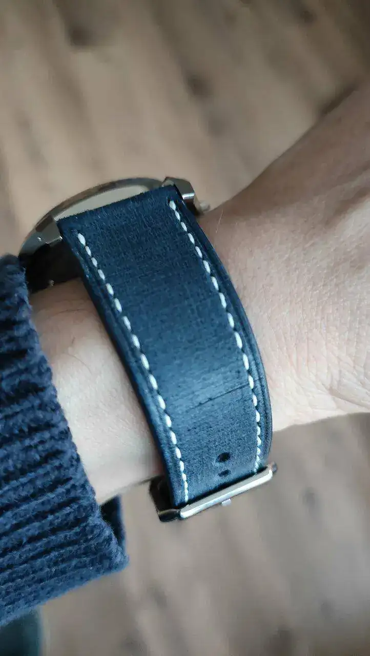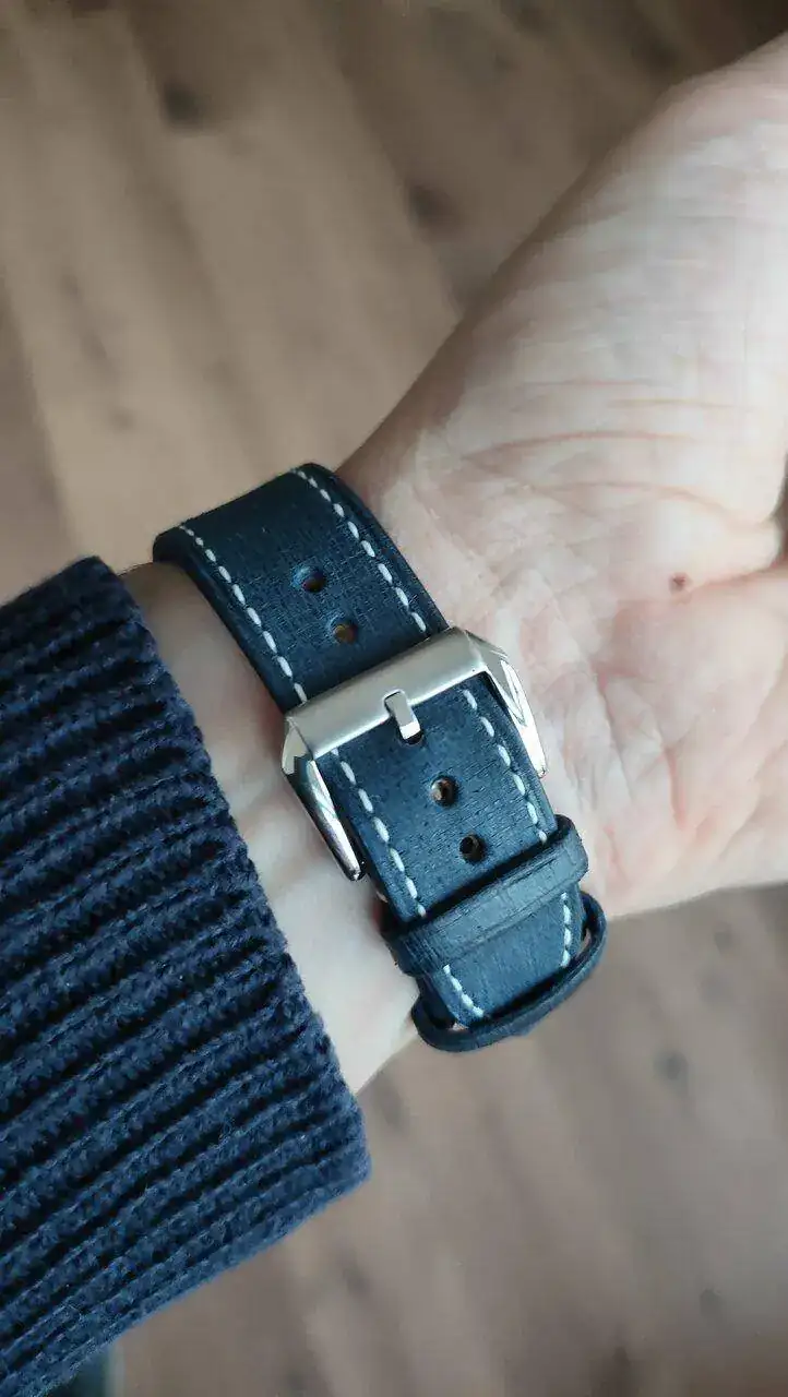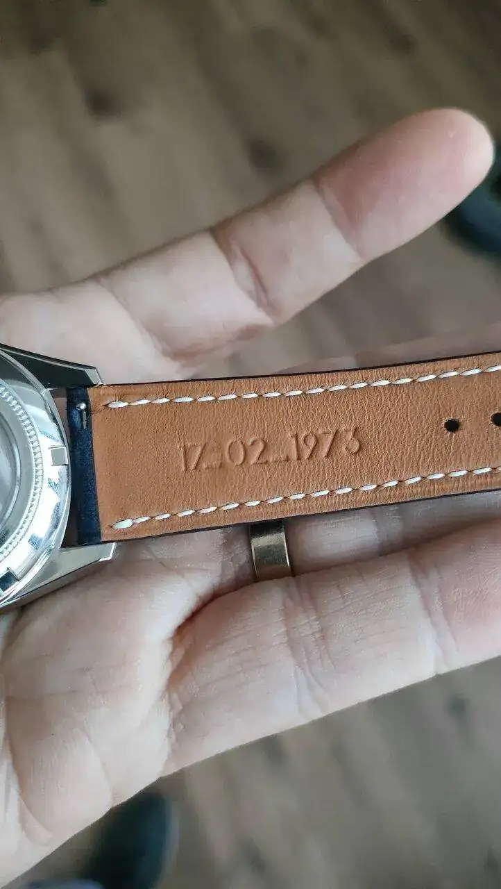 Y aquí otro autoregalo, por que yo lo valgo. En este caso una correa a juego con la esfera y pespunte blanco, además de estar grabada la fecha de mi nacimiento. Tengo 50 años y estoy en lo mejor de mi vida, con diferencia.