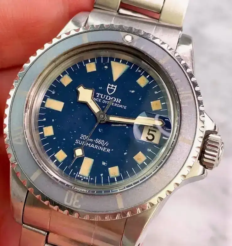 se aprecian los desperfectos de la esfera por deterioro del tritio (algo muy habitual en los 70, especialmente dañino en esferas azules 🙁). Deterioro producido por generación espontánea, por el mero paso del tiempo. Otras veces se aprecian arañazos en caja/plexi como consecuencia del roce en su almacenamiento; en este Geneve no es el caso y estaba impoluto en su exterior