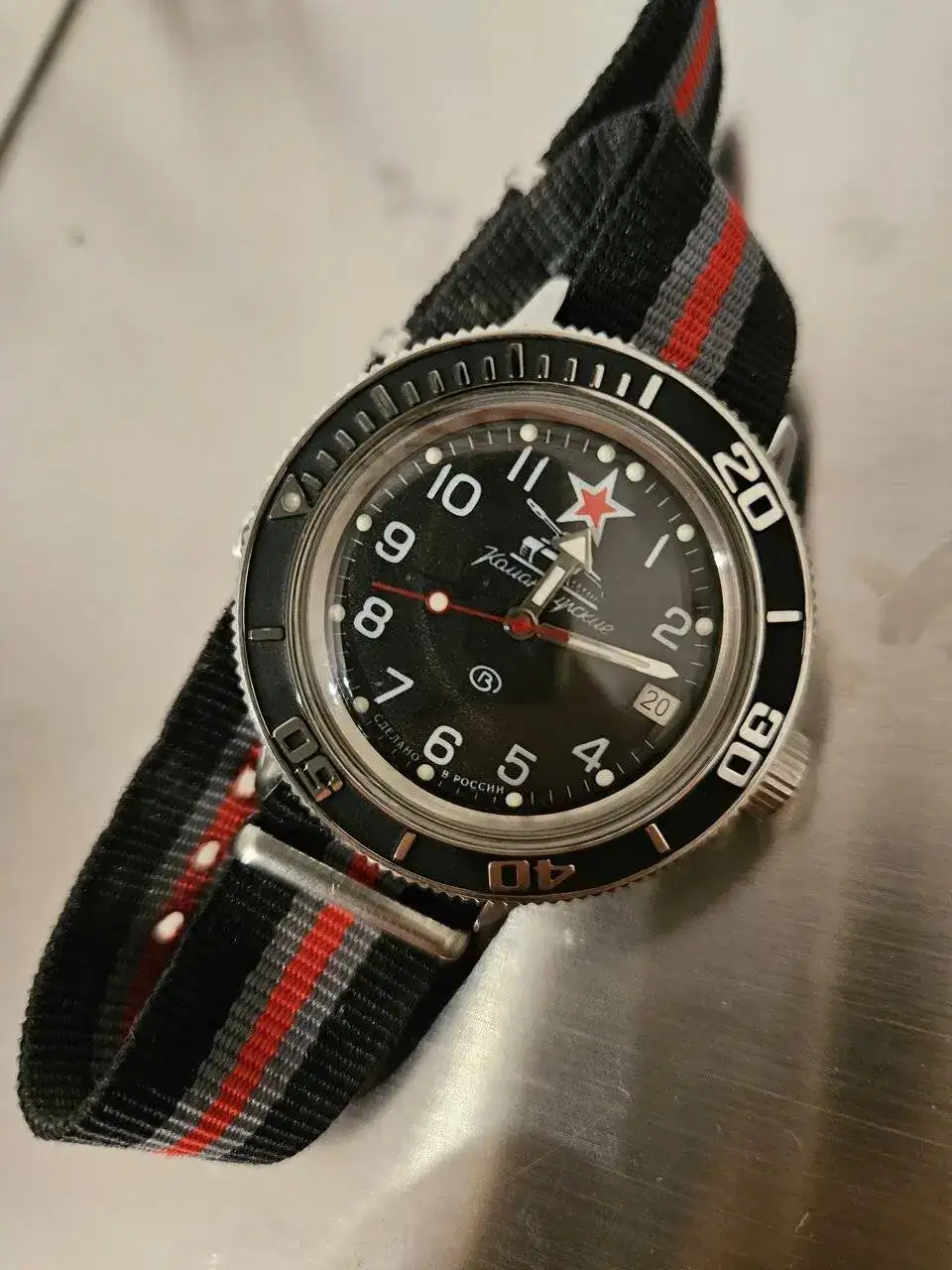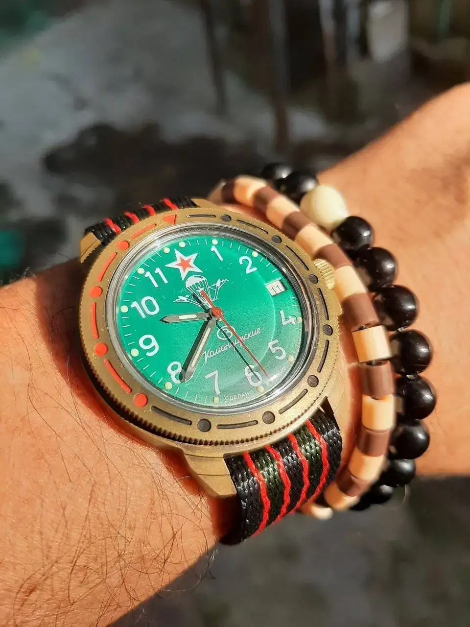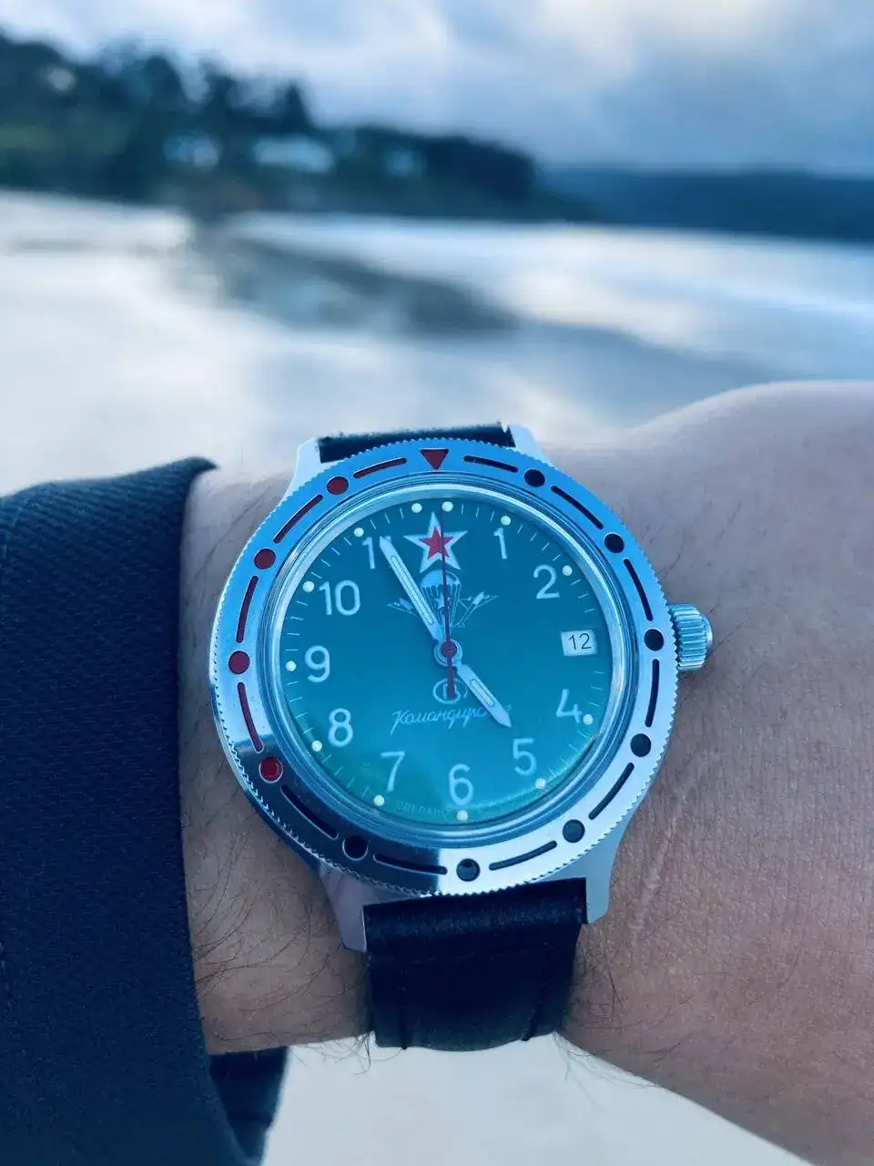 Hace unos meses conseguí de segunda mano un reloj Vostok, pero no consigo saber si es amphibia o Komandirskie. Hace tiempo habia escrito un hilo sobre mi Vostok azul de cuerda manual y me habiais explicado que era un "Komandirskie" y sus particularidades. El que muestro ahora es verde, automático, y como siempre la estrella roja la corona roscada el bisel giratorio( 20 minutos marcados en rojo) y la correa de cuero o más bien imitando al cuero. Admite carga manual. También desconozco el material del que está hecho el reloj lo que si se, es que pierde rápidamente brillo y se vuelve de color latón. El reloj no pesa, y es fácil y cómodo de llevar puesto.Adelanta del orden de 20 segundos al dia, para mi gusto es un reloj precioso y tiene pinta de ser duro. Adjunto fotos
