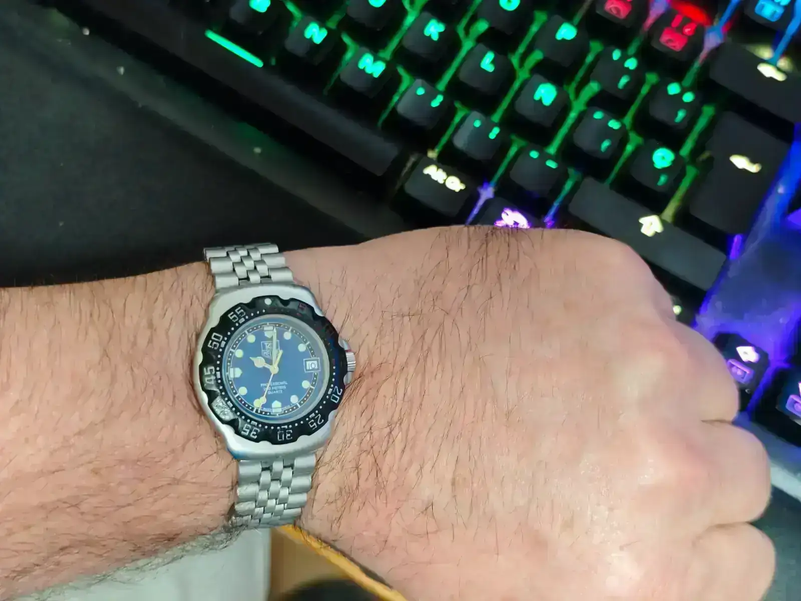 En la foto Tag Heuer F1. 35mm de diámetro, 40mm l2l. Teniendo en cuenta que mi ancho de muñeca es de 60mm aproximadamente , se hace evidente que sobra mucho armis por ambos lados. ¿Queda bonito? ¿Queda feo? Ahí es donde entra el juego el gusto de cada uno, y todos igual de válidos. A mi me resulta ridículo, y es una pena, porque me gustaría usar este reloj que lleva conmigo desde el 87 más o menos.