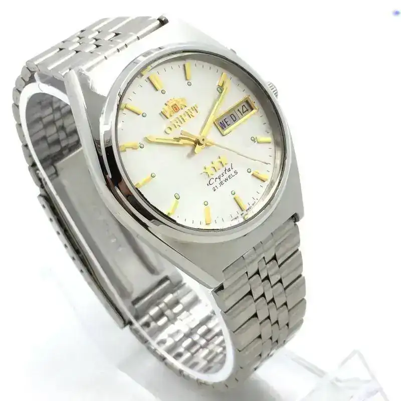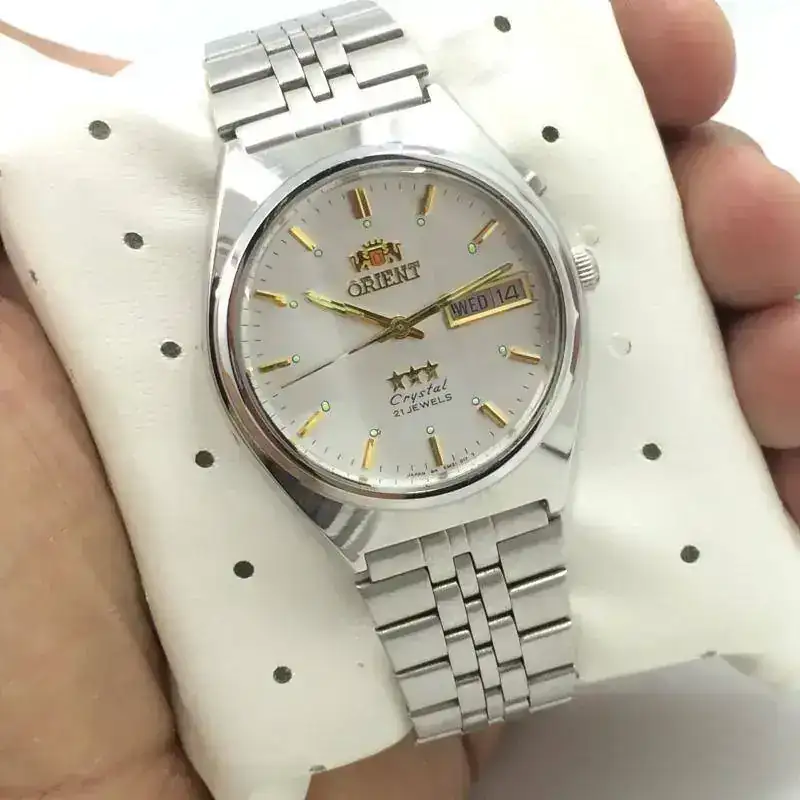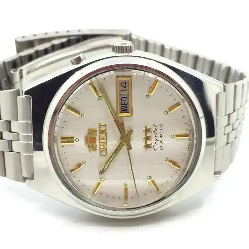 Un viejo relojero de mi ciudad, que se dedica a la compra y venta, pulido, cambio de baterias y reparación relojes, está ofreciendo este reloj Orient que sin deslumbrarme tampoco me disgusta. Y con ese impulso últimamente que he tenido por hacerme con un reloj de una época pasada, recurro al foro para hacerles una sencilla pero valiosa pregunta para mi caso.