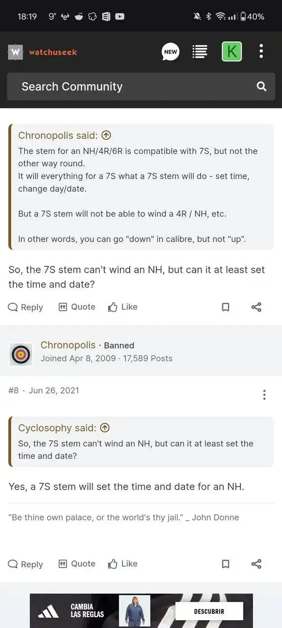 , pero ya te digo que al final no hubo manera de que la tija encajase en el NH36 no sé si por corta o por la forma. Al final tuve que cambiar la caja del Atlas por una compatible SKX007 donde la corona acepta la tija del movimiento nuevo.