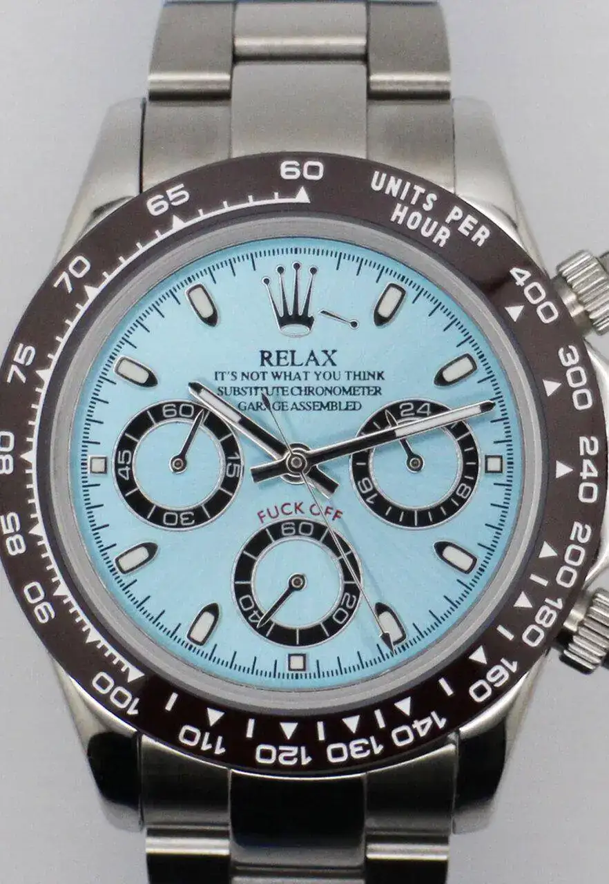 Pero si precisamente lo de Relax puede haceros gracia (a quienes os la haga) porque los relojes copian el diseño de los Rolex (y el diseño es, mas que "parte de", algo esencial y propio de los Rolex originales)...si pusiese Relax pero tuviese el diseño de, yo que sé, un Swatch Irony por ejemplo, pues no tendría ningún sentido llamarlos Relax ni os haría gracia...os hace gracia porque es una copia de un Rolex, digo yo eh !! que a lo mejor me equivoco oye, a lo mejor si pusiese Relax y fuese como un Berny o un Mondaine os hacía la misma gracia.