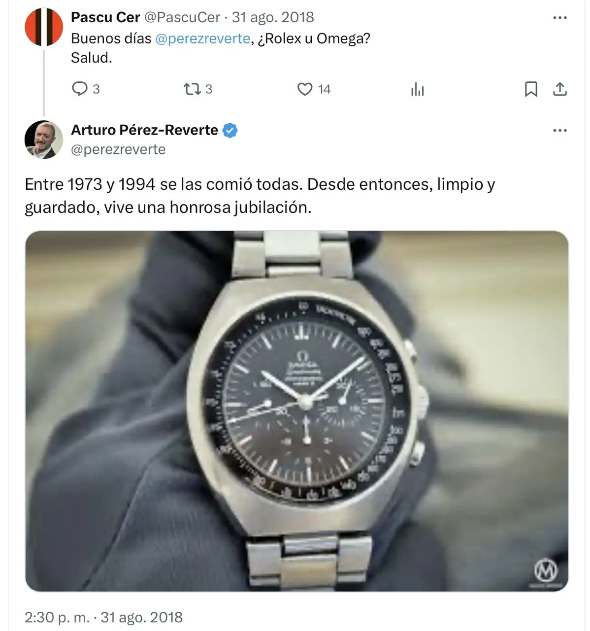 Después del Mark 4.5 y del 16610 he visto en una entrevista a Reverte con lo que parece un Speedmaster (más actual al que usaba antes).