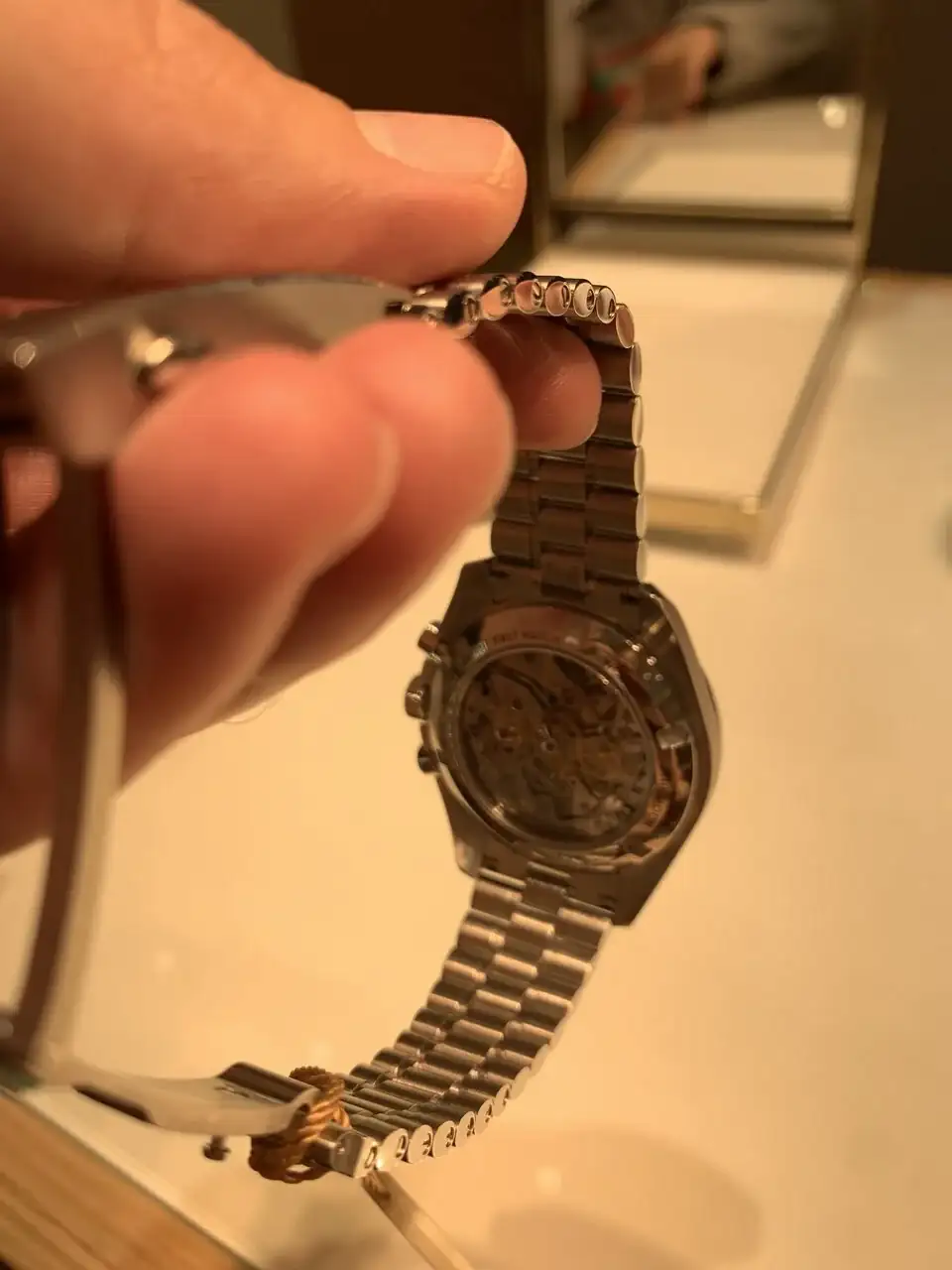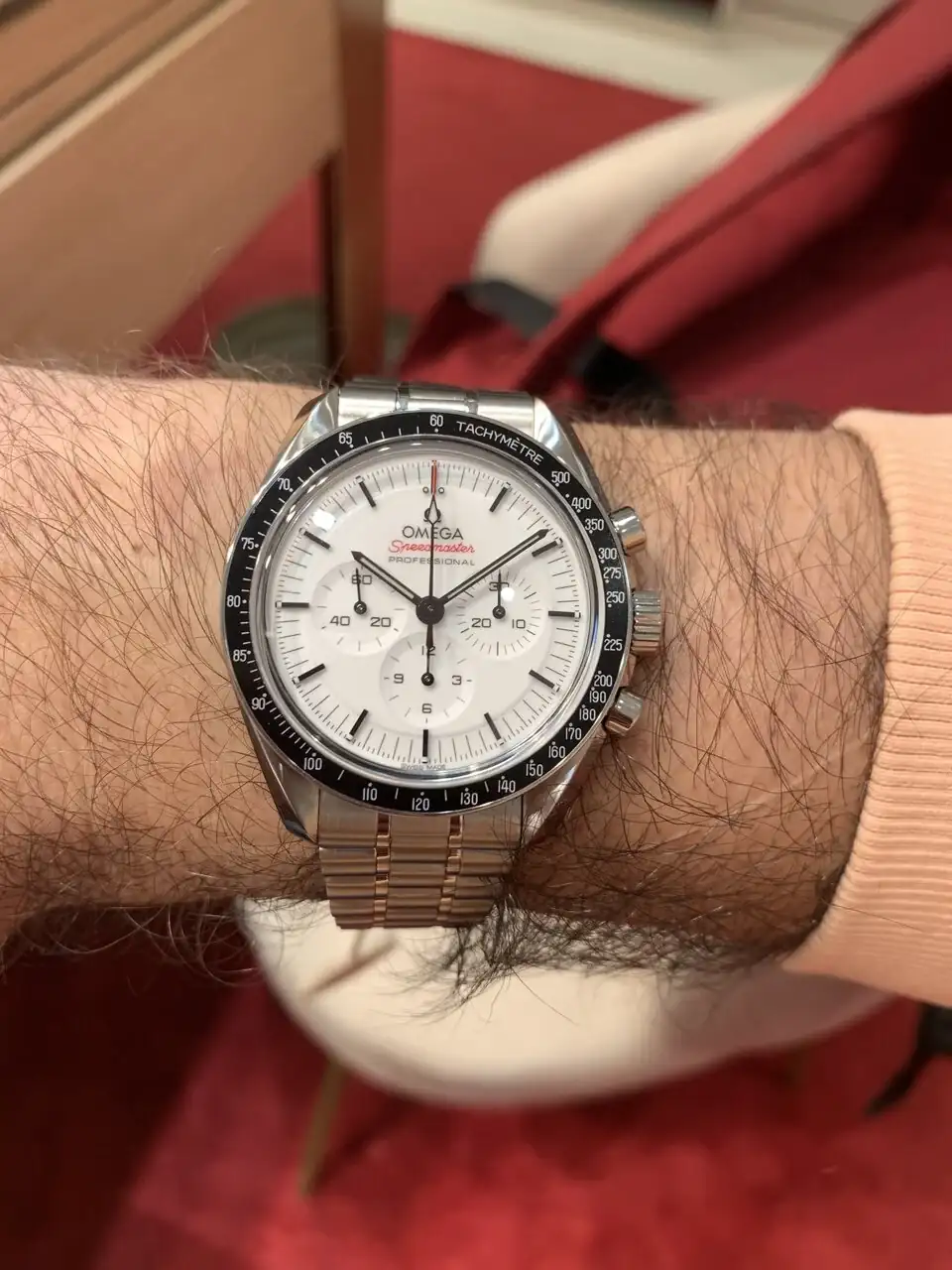 Mi única duda, no se si otros tendrán la impresión que me ha dado a mi, es que el armis parece un poco endeble o maleable, en especial por la zona de los end-links. Solo opinión personal pero Segunda vez que me pasa con el Speedmaster. El modelo con pulsera de piel y pespuntes blancos y rojos quiero verlo.